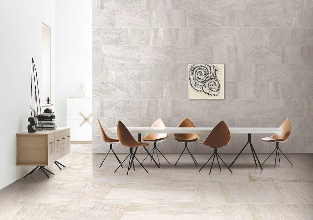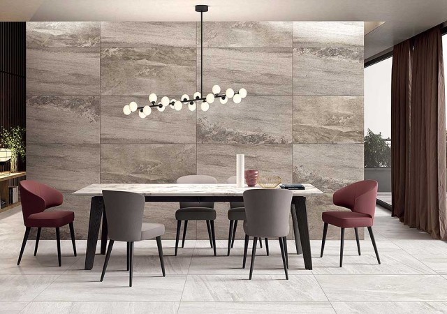 云朵拉”系列纹理是将云朵拉原石纹理与立体肌理相结合,古朴自然。瓷砖整体以灰调为主,呈现出淡淡的线条感,给人一种写意的感觉。运用20度暖灰,自然明快;运用40度冷灰,素雅自然。