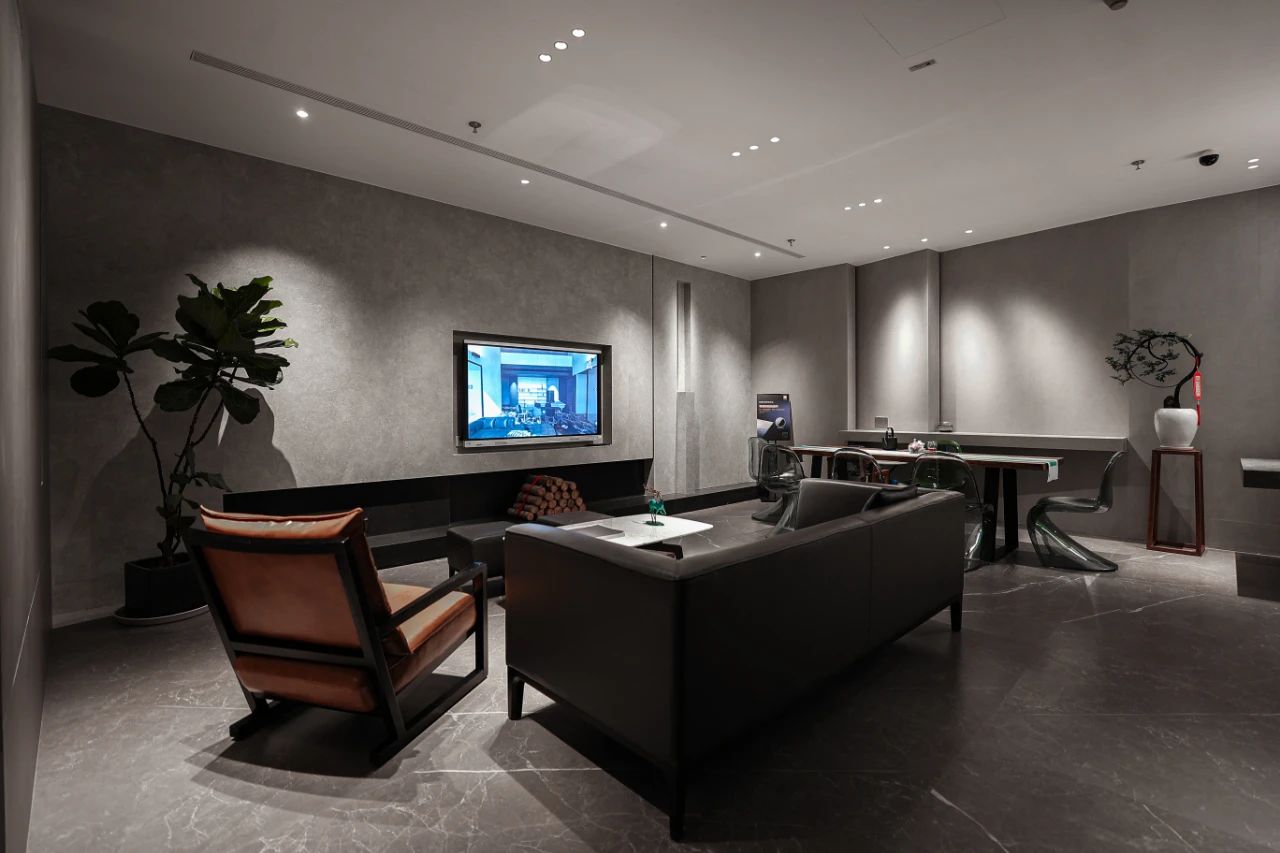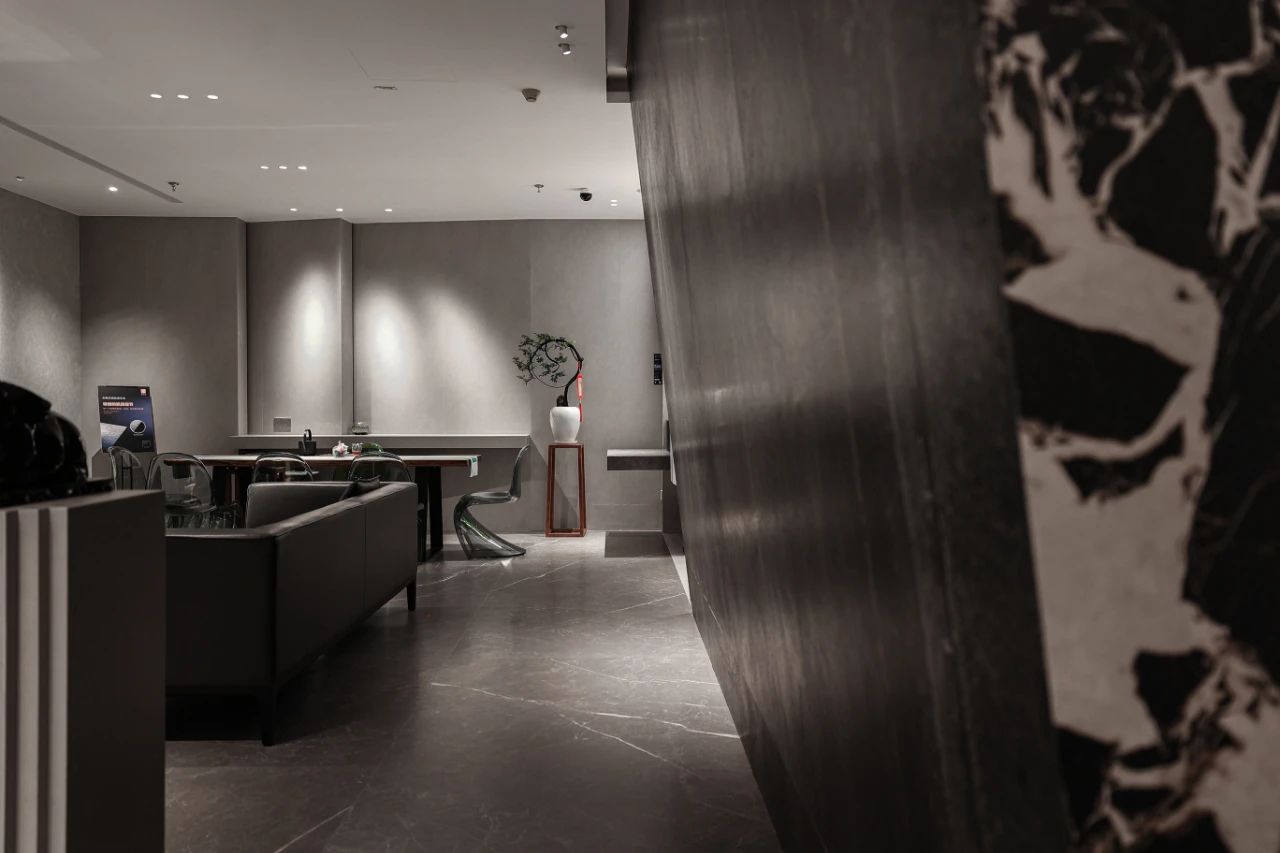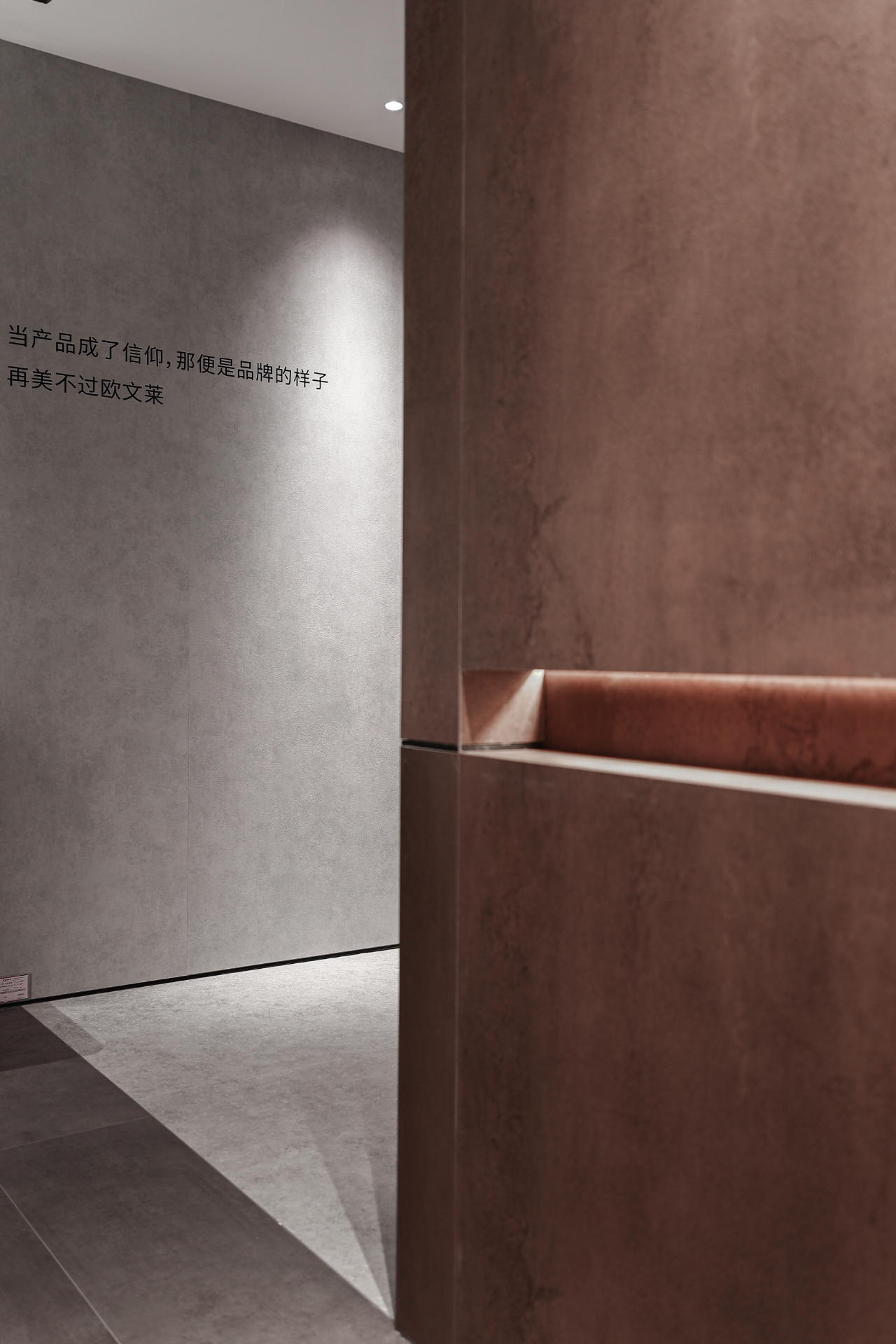 欧文莱厦门高级体验店美感的精髓,主要体现在用色克制,有温度的朴拙感。欧文莱的审美不被一时风向左右,在常年摸索中,偏爱在自然元素、时间痕迹、艺术人文中寻找灵感,形成自己的素色美学设计观,产品应高阶审美而生。新店从外立面到门厅部分皆紧密围绕第七代符号产品[时光盒子]系列展开,既有大面积铺陈的简约干净,亦有晕染自然的水墨画般艺术美感,营造出如艺术馆的空间张力。整个空间应用内建筑的手法,在不同切割、拼合的几何中,呈现出精致的线条感与强烈的空间感。通过丰富的设计细节,创造出功能与美感共融的视觉焦点。几何影壁、楼梯踏步、墙体凹槽……暗藏光源从一侧透出,成为空间中引人入胜的细节景致;在整个灯光系统的营造下,则是一气呵成的自然流淌,于无声处带来妥帖体验感。行走中放慢脚步,每一步都可感受移步换景的建筑空间艺术。从门厅、家居体验场景延伸至选材区,通过软装的排列布局营造出温馨的空间场域,可远观、可近赏。对理想主义者来说,装修是陷入一场对细节的锱铢必较,辛苦却值得。欧文莱精品岩板、素色瓷砖作为空间的主要材料,纹理素雅、光感柔和、触感舒适、内敛的高级感,运用到场景中,表现出质感满盈的视觉效果。