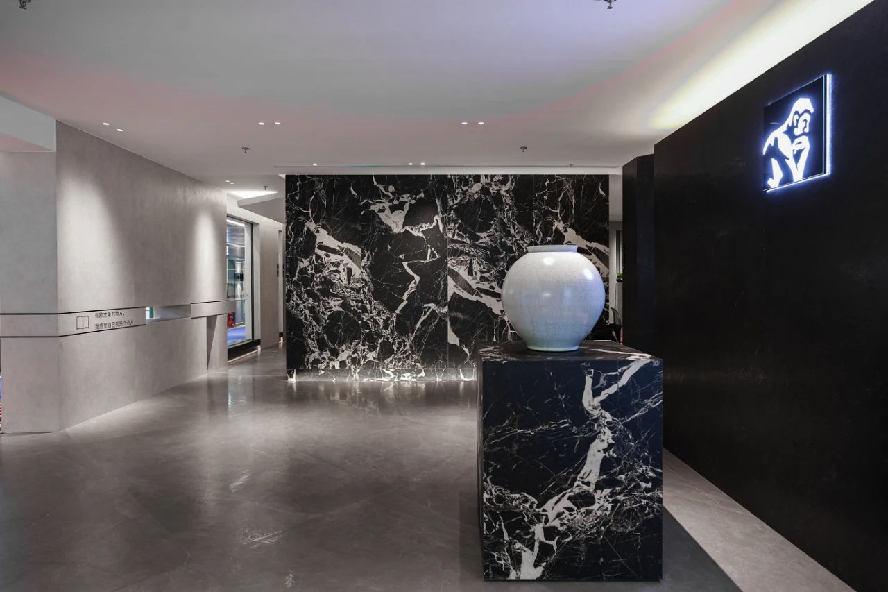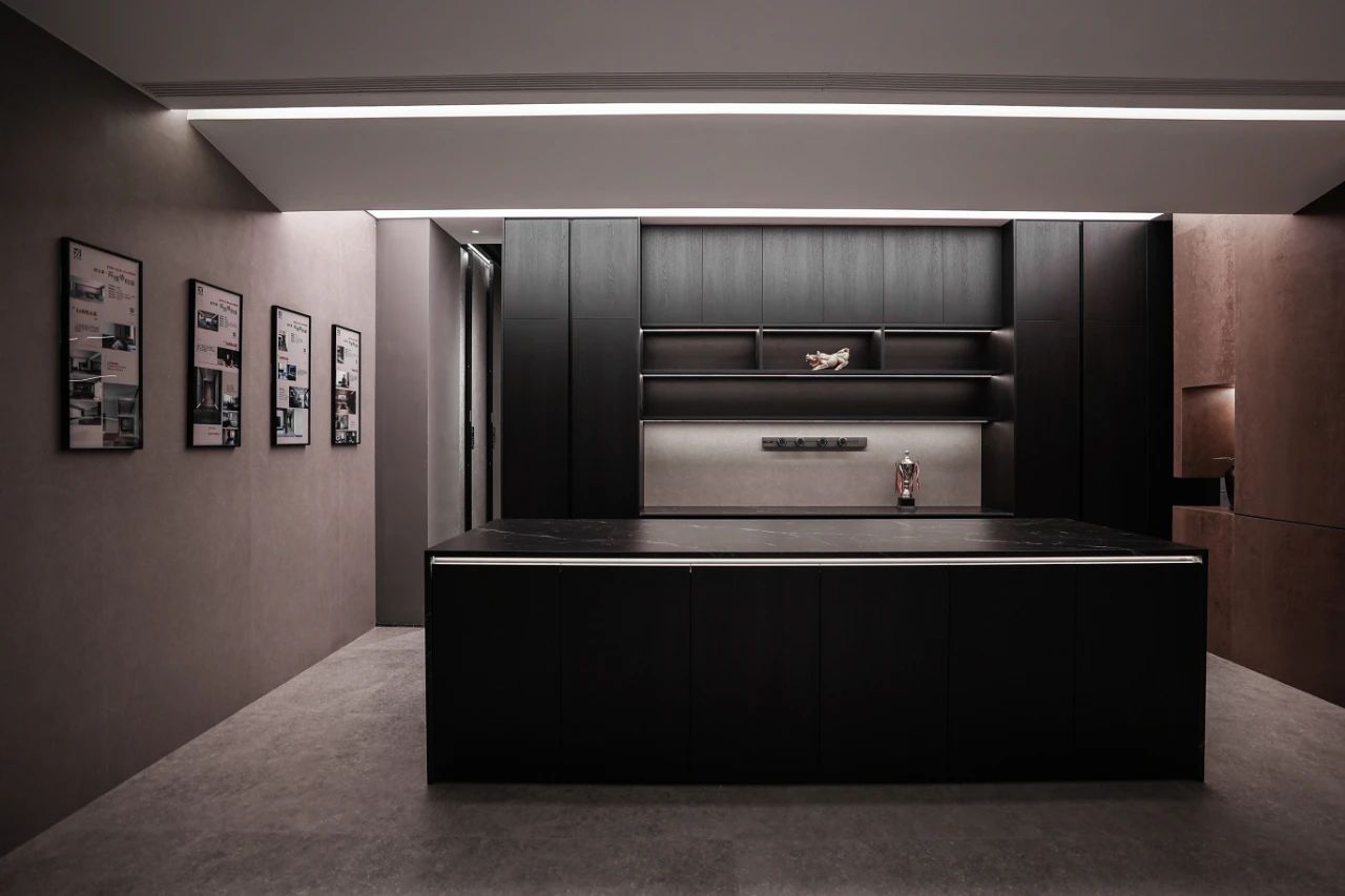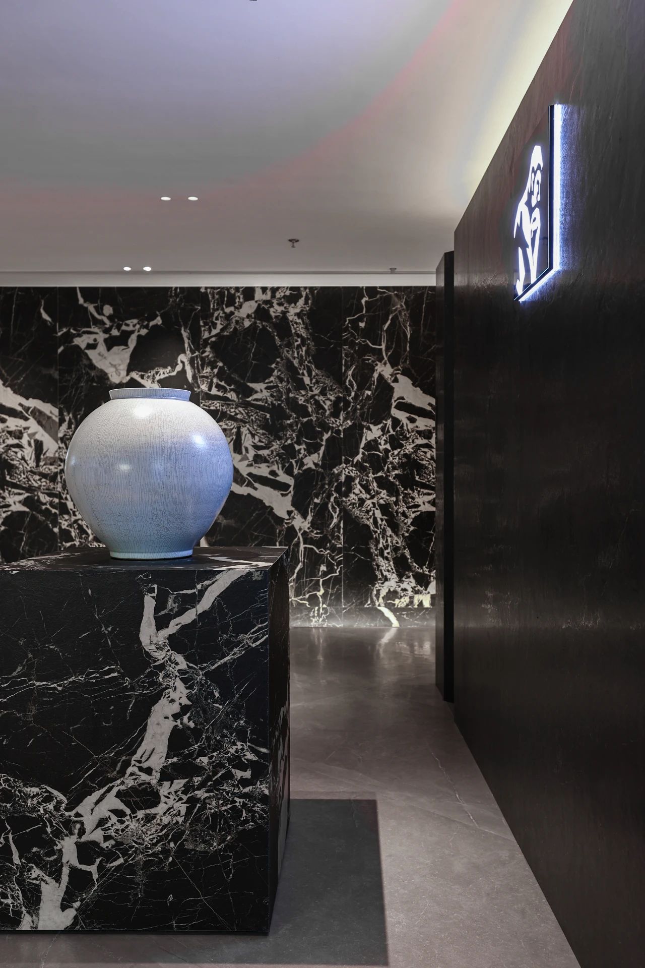 欧文莱厦门高级体验店美感的精髓,主要体现在用色克制,有温度的朴拙感。欧文莱的审美不被一时风向左右,在常年摸索中,偏爱在自然元素、时间痕迹、艺术人文中寻找灵感,形成自己的素色美学设计观,产品应高阶审美而生。新店从外立面到门厅部分皆紧密围绕第七代符号产品[时光盒子]系列展开,既有大面积铺陈的简约干净,亦有晕染自然的水墨画般艺术美感,营造出如艺术馆的空间张力。整个空间应用内建筑的手法,在不同切割、拼合的几何中,呈现出精致的线条感与强烈的空间感。通过丰富的设计细节,创造出功能与美感共融的视觉焦点。几何影壁、楼梯踏步、墙体凹槽……暗藏光源从一侧透出,成为空间中引人入胜的细节景致;在整个灯光系统的营造下,则是一气呵成的自然流淌,于无声处带来妥帖体验感。行走中放慢脚步,每一步都可感受移步换景的建筑空间艺术。从门厅、家居体验场景延伸至选材区,通过软装的排列布局营造出温馨的空间场域,可远观、可近赏。对理想主义者来说,装修是陷入一场对细节的锱铢必较,辛苦却值得。欧文莱精品岩板、素色瓷砖作为空间的主要材料,纹理素雅、光感柔和、触感舒适、内敛的高级感,运用到场景中,表现出质感满盈的视觉效果。