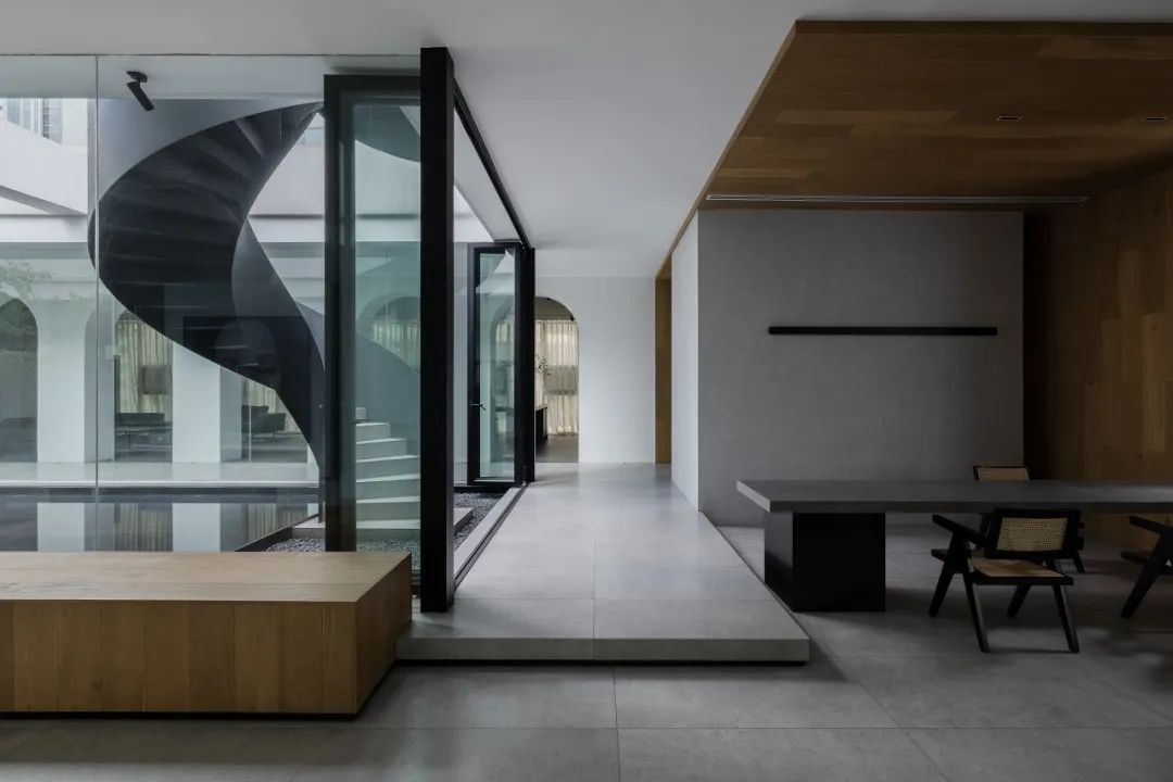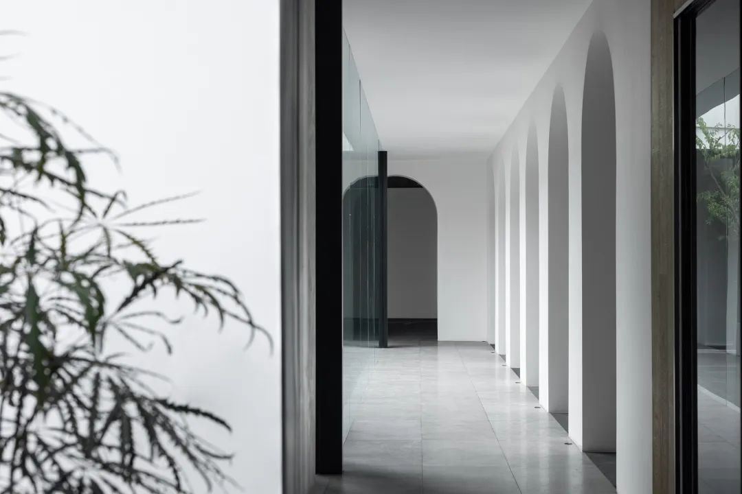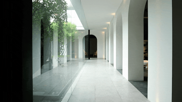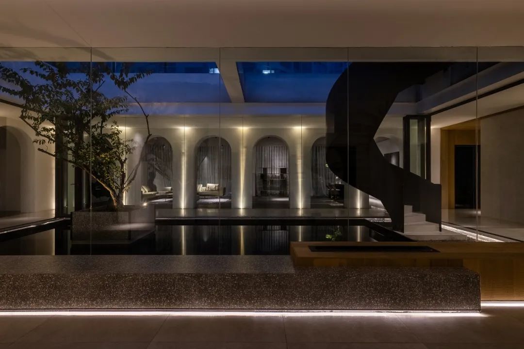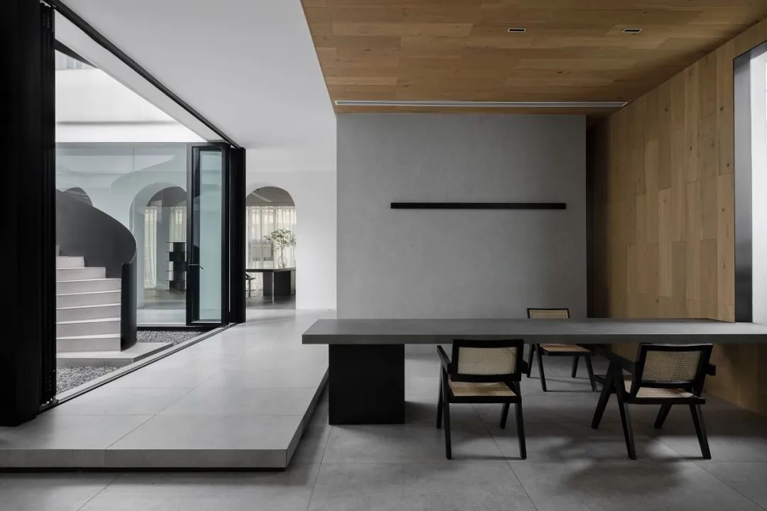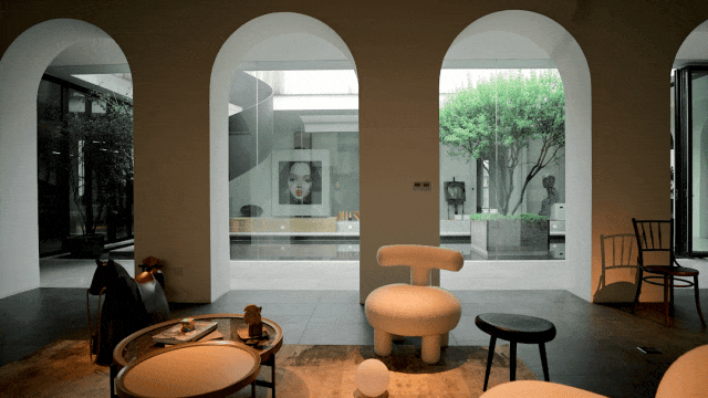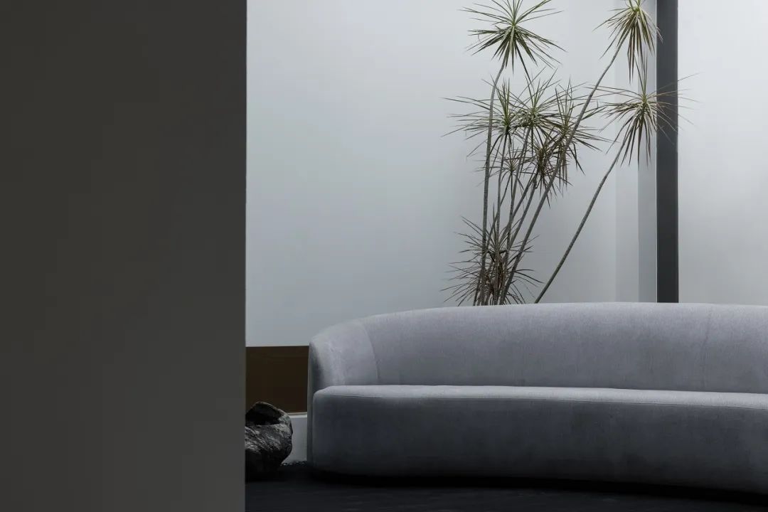 与很多公司传统的进门设计不同,整个空间的设计是随性的,去前台化的,没有太多的条条框框,让思路自然打开。设计师表示,首先穿过画廊,抵达区间前的路途,采用了先抑后扬的手法。这样一个相对安静的空间,是经由身体至心理的前奏铺垫,在过程中去欣赏和了解新成对设计的理解,然后穿透到一个打开的状态,豁然开朗,像桃花源记一样。陶渊明的《桃花源记》,借武陵渔人行踪这一线索,把现实和理想境界联系起来,为世人创造了一个世外桃源的想象。芳草鲜美,落英缤纷,阡陌交通,鸡犬相闻。快节奏的现代社会生活,每个人都急匆匆的在往前奔忙,驻足美景、流连趣事越来越成为人们生活里不可或缺的精神养分。时至今日,桃花源的意义不只是一个标签性很强的概念、一个理想化的图腾,寻找桃花源,寻找的,是在快节奏生活状态下,一个暂得喘息的理想出口,是理想生活的肇始与初心。一缕清风,几片闲云,还有绿植散发出的大自然清冽悠香,颇有一种“久在樊笼里,复得返自然”的豁然。沿着廊道向前走,艺术画作的设置让空间处于一种悬浮状态,既简单又不呆板,一些盒子状的穿插结构,拾级而上,感觉更灵活灵动。视线中的艺术楼梯,拾级而上,则可抵达二层的园林。存在于整个空间当中,它像一件艺术品,亦给人以上下的尺度感。铺设廊道的是欧文莱“灰印象”系列瓷砖(点击跳转介绍),在光线映衬下展现出丰富的层次感和自然肌纹,化繁为简,以刚驭柔,为整个场所平添几分气度与生命力度。“灰印象”还原自然石材的质感状态,肌肤与砖之间的温润度,更好还原设计理念的简约肌理,亦成为了它被青睐与选择的原因。“素色能融入到整个空间里面来,能更好地表达设计作品本身,而不是砖本身。我们选择材质的时候用的是基本是素色和木色,因为想让自然的东西带到我们的生活中来。欧文莱的素色砖的特点就是质感非常好,和大自然能融为一体,给人以包容感。”“我们选择的砖以及设计空间的所有材质,它们未来都是一个整体,而不是某一个单独的东西跳脱出来,它不应该这样传递。‘灰印象’表面凹凸的小肌理,像极了雨后小路,它更好地把外面的水景和自然融合到了一起。”夕阳渐昏的光线将整个空间包裹,华灯初上,氛围阔朗而静谧。“好的设计没有太多的形式化,欧文莱(素色砖)的灰度可以让我们在不同空间,不同场景去表达不同的光感感受,阴影感受,以及光和空间怎么做一个更好的结合,生动的状态。”四边廊道围合出一方天地,设计师将中国传统四合院和古罗马斗兽场拱形元素等西化造型相结合,希望达到一种巧妙的衔接,产生一种东西方的融合之美。放眼可见,中古的金箔屏风、经典的昌迪加尔椅、当代的极简柜体等不同时期的元素进行和谐对话,具有人文色彩的素色瓷砖、时尚感的大理石及玻璃材质、石竹等元素的混搭,通过光线调教,构筑属于现代人的意象之居。作为接待室的空间,也作为平时朋友相聚的场所,融入了设计师对生活方式的理解。参考中国的四水归堂设计理念,空间布置得紧凑,而又自然连通。各个空间各具艺术感染力,在花叶漫漫中自成焦点,却又与周遭一切脉韵连贯,相得益彰。四季草木,郁郁葱葱,仿佛信手拈来的诗情画意,却对空间进行了巧妙而合理地划分,保证各部分独立性的同时去除疏离与突兀,使空间叙事具有连贯性及整体性。设计师希望,一切都是回归到自然里面的。整个空间材质以素色、木色为主色调,以框景手法,将自然之景引入空间之中,虚实结合,移步换景,借景造景,将室外和室内形成无缝的链接,营造一种回味悠长的意境之美。都市喧嚣隐匿在桃花源般的宁静和美中,此情此景,人与空间情感交融。啜饮谈天,偷得浮生半日闲,这是一种温和的、潜移默化的促成。每个区间有各自不同的尺度和性格,但殊途同归,可见的是设计师对空间设计的理解,以及在人文生活情境上的打磨。新成空间艺术成立于2007年,是一家专注于高端私宅设计研究与实践的事务所,致力于引领东方现代居住审美,平衡精致的美感与生活方式的魅力,提倡无风格设计。通过研究空间与人的关系与感受,构建当下人对空间的物质与精神的感受。