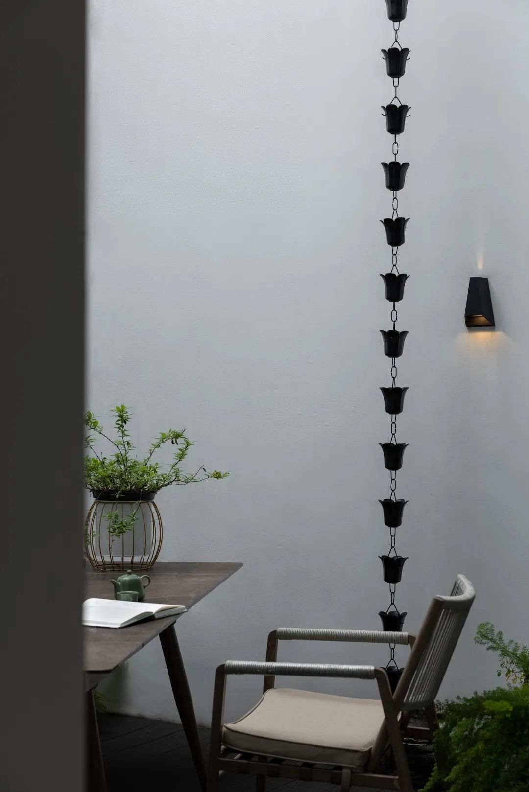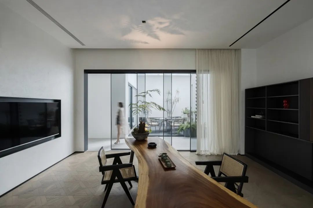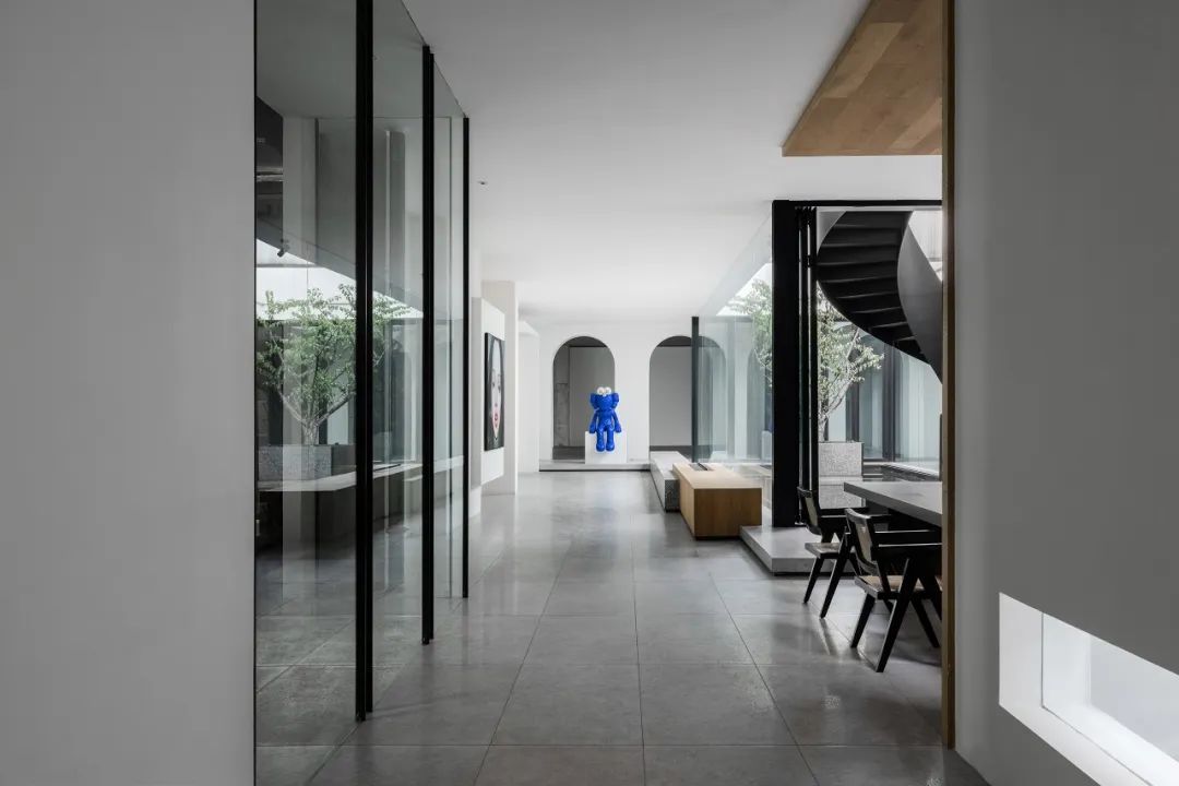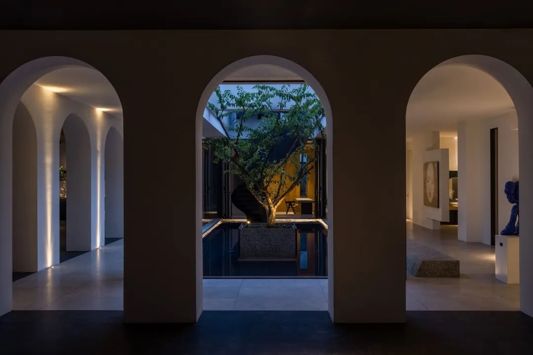 与很多公司传统的进门设计不同,整个空间的设计是随性的,去前台化的,没有太多的条条框框,让思路自然打开。设计师表示,首先穿过画廊,抵达区间前的路途,采用了先抑后扬的手法。这样一个相对安静的空间,是经由身体至心理的前奏铺垫,在过程中去欣赏和了解新成对设计的理解,然后穿透到一个打开的状态,豁然开朗,像桃花源记一样。陶渊明的《桃花源记》,借武陵渔人行踪这一线索,把现实和理想境界联系起来,为世人创造了一个世外桃源的想象。芳草鲜美,落英缤纷,阡陌交通,鸡犬相闻。快节奏的现代社会生活,每个人都急匆匆的在往前奔忙,驻足美景、流连趣事越来越成为人们生活里不可或缺的精神养分。时至今日,桃花源的意义不只是一个标签性很强的概念、一个理想化的图腾,寻找桃花源,寻找的,是在快节奏生活状态下,一个暂得喘息的理想出口,是理想生活的肇始与初心。一缕清风,几片闲云,还有绿植散发出的大自然清冽悠香,颇有一种“久在樊笼里,复得返自然”的豁然。沿着廊道向前走,艺术画作的设置让空间处于一种悬浮状态,既简单又不呆板,一些盒子状的穿插结构,拾级而上,感觉更灵活灵动。视线中的艺术楼梯,拾级而上,则可抵达二层的园林。存在于整个空间当中,它像一件艺术品,亦给人以上下的尺度感。铺设廊道的是欧文莱“灰印象”系列瓷砖(点击跳转介绍),在光线映衬下展现出丰富的层次感和自然肌纹,化繁为简,以刚驭柔,为整个场所平添几分气度与生命力度。“灰印象”还原自然石材的质感状态,肌肤与砖之间的温润度,更好还原设计理念的简约肌理,亦成为了它被青睐与选择的原因。“素色能融入到整个空间里面来,能更好地表达设计作品本身,而不是砖本身。我们选择材质的时候用的是基本是素色和木色,因为想让自然的东西带到我们的生活中来。欧文莱的素色砖的特点就是质感非常好,和大自然能融为一体,给人以包容感。”“我们选择的砖以及设计空间的所有材质,它们未来都是一个整体,而不是某一个单独的东西跳脱出来,它不应该这样传递。‘灰印象’表面凹凸的小肌理,像极了雨后小路,它更好地把外面的水景和自然融合到了一起。”夕阳渐昏的光线将整个空间包裹,华灯初上,氛围阔朗而静谧。“好的设计没有太多的形式化,欧文莱(素色砖)的灰度可以让我们在不同空间,不同场景去表达不同的光感感受,阴影感受,以及光和空间怎么做一个更好的结合,生动的状态。”四边廊道围合出一方天地,设计师将中国传统四合院和古罗马斗兽场拱形元素等西化造型相结合,希望达到一种巧妙的衔接,产生一种东西方的融合之美。放眼可见,中古的金箔屏风、经典的昌迪加尔椅、当代的极简柜体等不同时期的元素进行和谐对话,具有人文色彩的素色瓷砖、时尚感的大理石及玻璃材质、石竹等元素的混搭,通过光线调教,构筑属于现代人的意象之居。作为接待室的空间,也作为平时朋友相聚的场所,融入了设计师对生活方式的理解。参考中国的四水归堂设计理念,空间布置得紧凑,而又自然连通。各个空间各具艺术感染力,在花叶漫漫中自成焦点,却又与周遭一切脉韵连贯,相得益彰。四季草木,郁郁葱葱,仿佛信手拈来的诗情画意,却对空间进行了巧妙而合理地划分,保证各部分独立性的同时去除疏离与突兀,使空间叙事具有连贯性及整体性。设计师希望,一切都是回归到自然里面的。整个空间材质以素色、木色为主色调,以框景手法,将自然之景引入空间之中,虚实结合,移步换景,借景造景,将室外和室内形成无缝的链接,营造一种回味悠长的意境之美。都市喧嚣隐匿在桃花源般的宁静和美中,此情此景,人与空间情感交融。啜饮谈天,偷得浮生半日闲,这是一种温和的、潜移默化的促成。每个区间有各自不同的尺度和性格,但殊途同归,可见的是设计师对空间设计的理解,以及在人文生活情境上的打磨。新成空间艺术成立于2007年,是一家专注于高端私宅设计研究与实践的事务所,致力于引领东方现代居住审美,平衡精致的美感与生活方式的魅力,提倡无风格设计。通过研究空间与人的关系与感受,构建当下人对空间的物质与精神的感受。