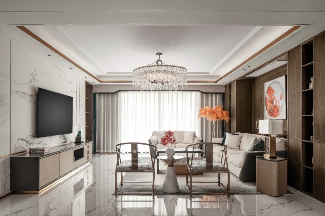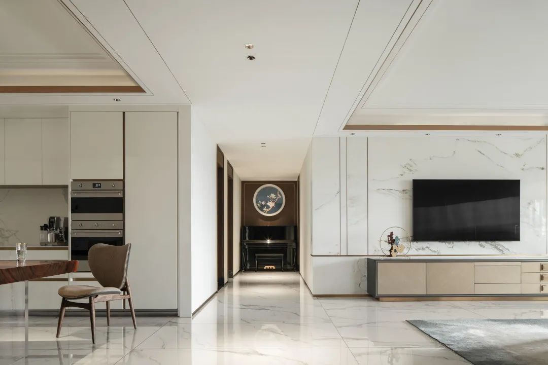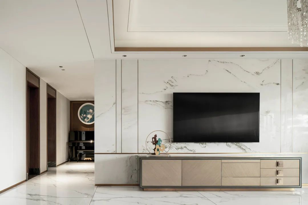 地面选择“卡拉拉”系列,自然飘逸,如点墨入水后的姿态,高贵和优雅气质发挥得淋漓尽致,交融现代简约的软装装饰,演绎新式中国风。