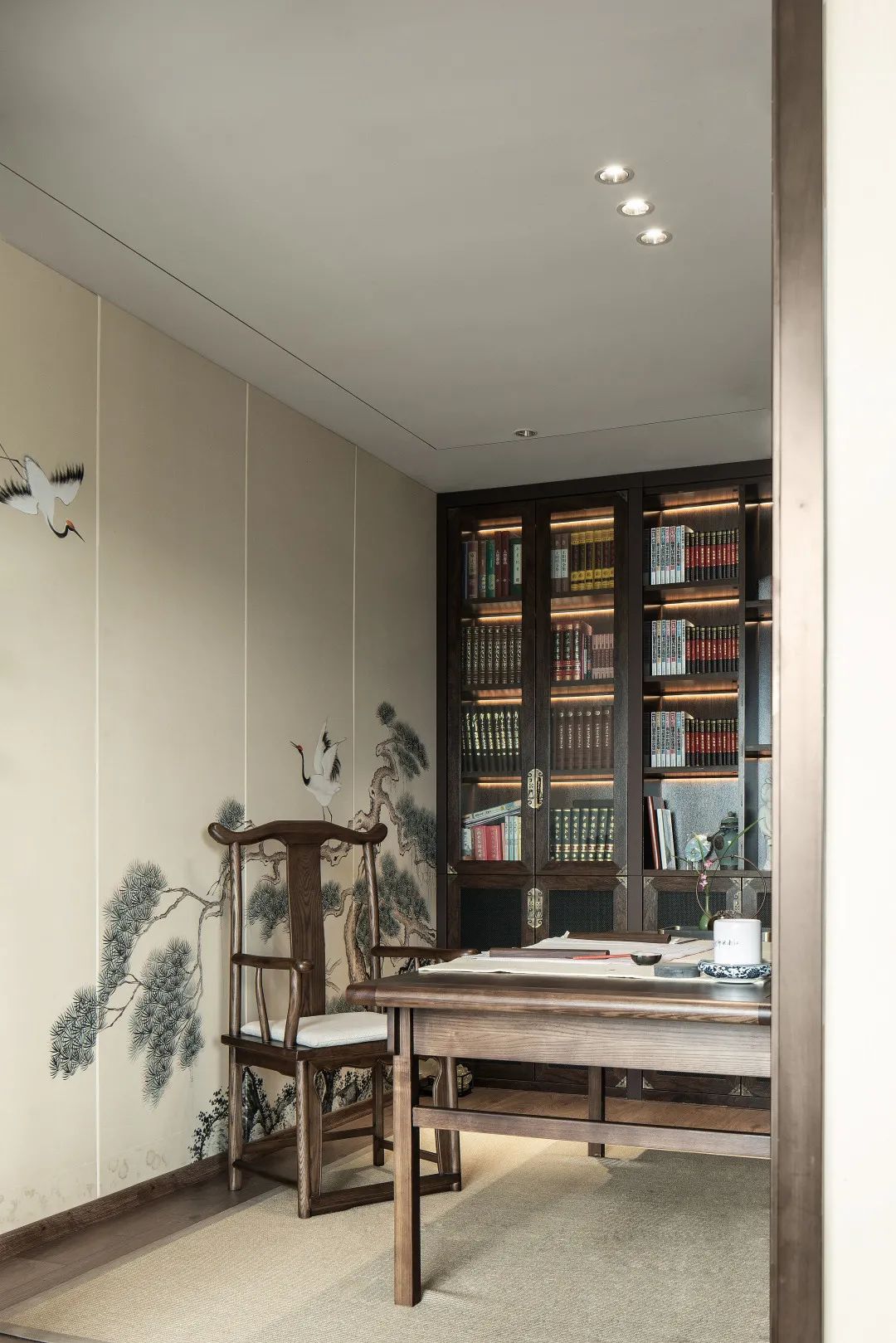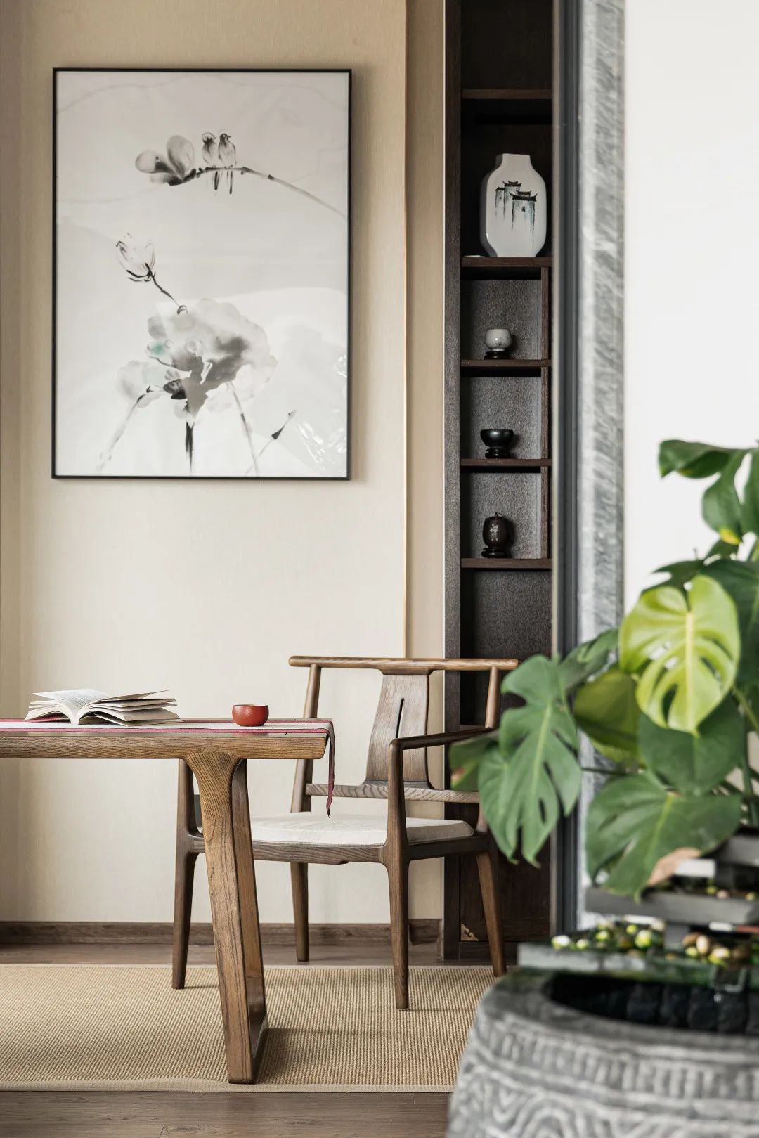 茶室与书房是女主人品茗习字的场所,两处连通,浑然一体。房中置一长桌、一对椅、一壶茶、一砚台,时光流转,茶香缱绻,是家中最具中式古典意味的空间。