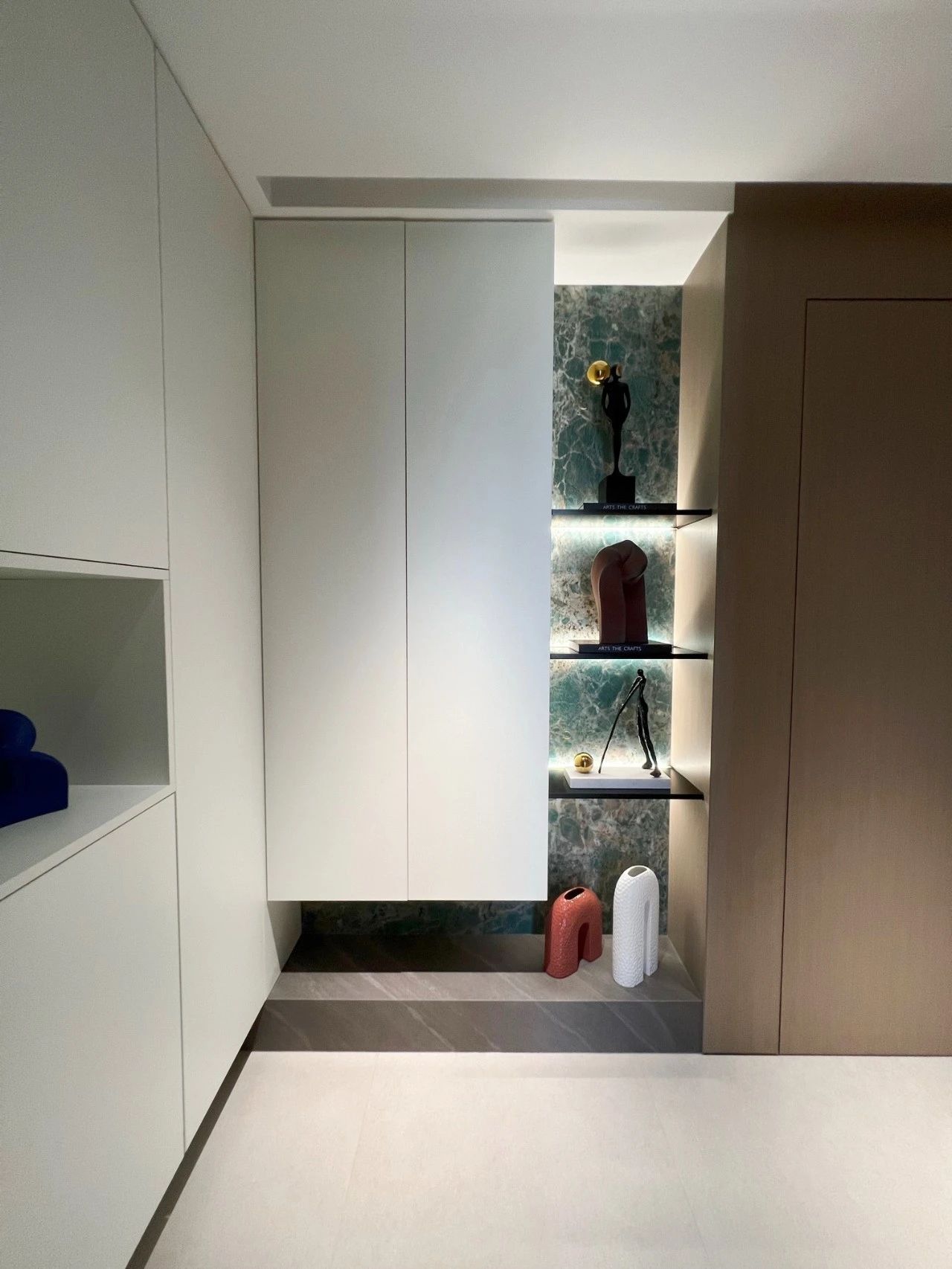 设计,便是把不同的材质属性在以相同的设计语言巧妙融合。结合素色瓷砖、岩板、烤漆板、不锈钢、木饰面、艺术漆、艺术玻璃多种材质搭配,更显简单利落的清爽气质。
