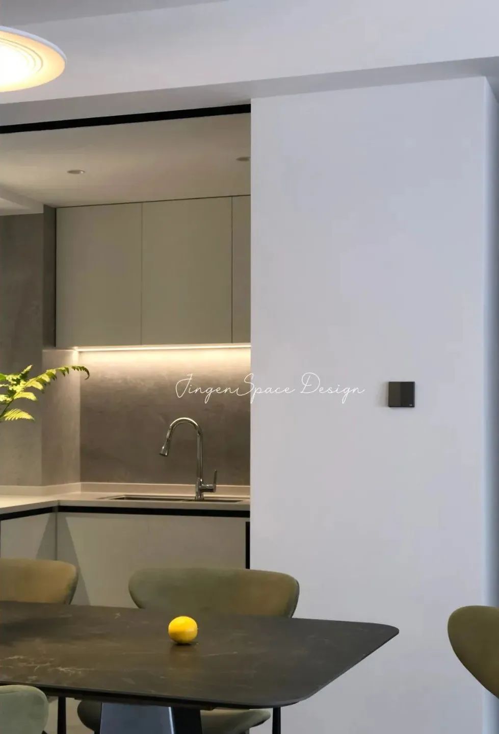 黑色餐桌仿佛与客厅茶几相互呼应,凭借着简约时尚的风格、精秀外形和优雅配色,餐桌可赋予整个餐厅不仅实用,还有丰富的可观赏性。简洁统一的用色搭配为空间整体带来了更多的张力,黑色、灰色、绿色让整个空间在色彩上有了一定的对比,同时悬挂的吊灯又增加空间当中的艺术感,让空间氛围变得更加宁静舒适。厨房与餐厅相互衔接,选用了白色主调的柜体搭配灰调空间,“高级灰4.0”柔和的肌理凸显了空间整体的细腻质感。-