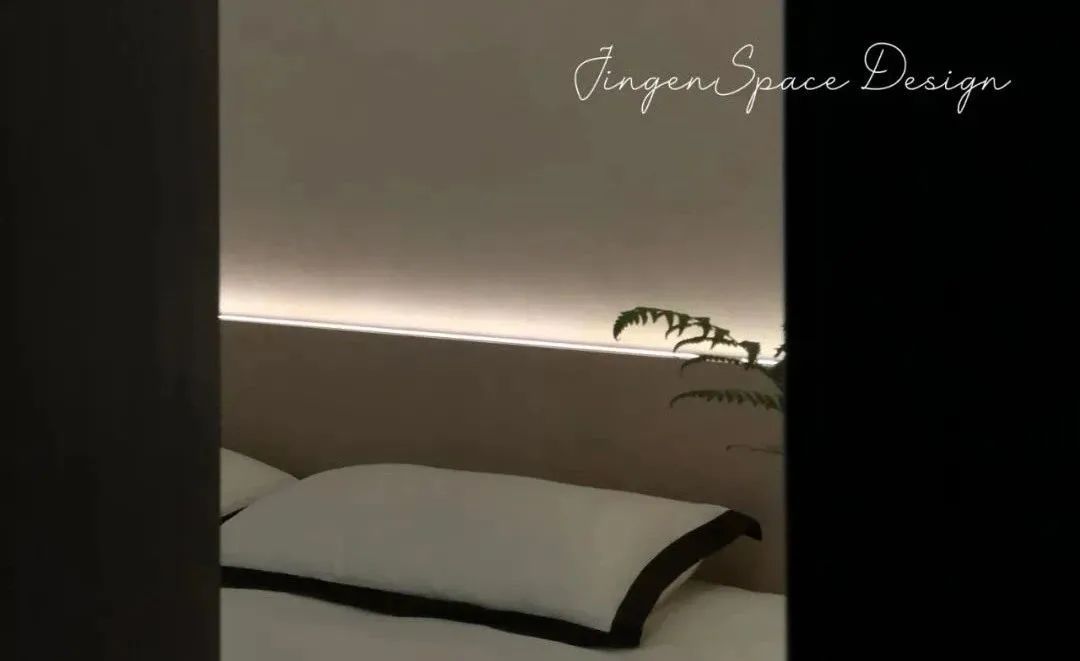 在床头暖光的加持下,卧室依旧延续了具有温度的暖灰调性,突出整个空间当中的宁静氛围,白色衣柜和整体风格相互结合,清新利落,营造温馨舒适的休憩空间,让人更加自然、自在。卫生间中材质的肌理感增添了空间的精致感,简雅而素淡,形成了相对舒适的空间氛围。