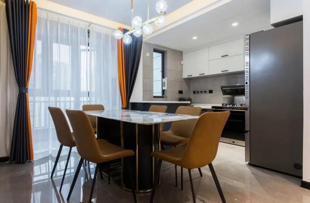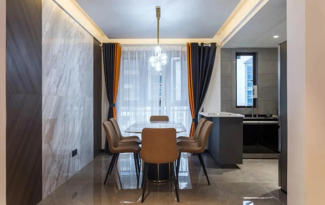 餐厅的地面材质,墙面的大理石和木饰板与客厅一致,保证整个风格的统一。黄铜+石材设计的餐桌、细腿的餐椅、线条感强的吊灯,很好的平衡了整个空间的气场,简约大气。