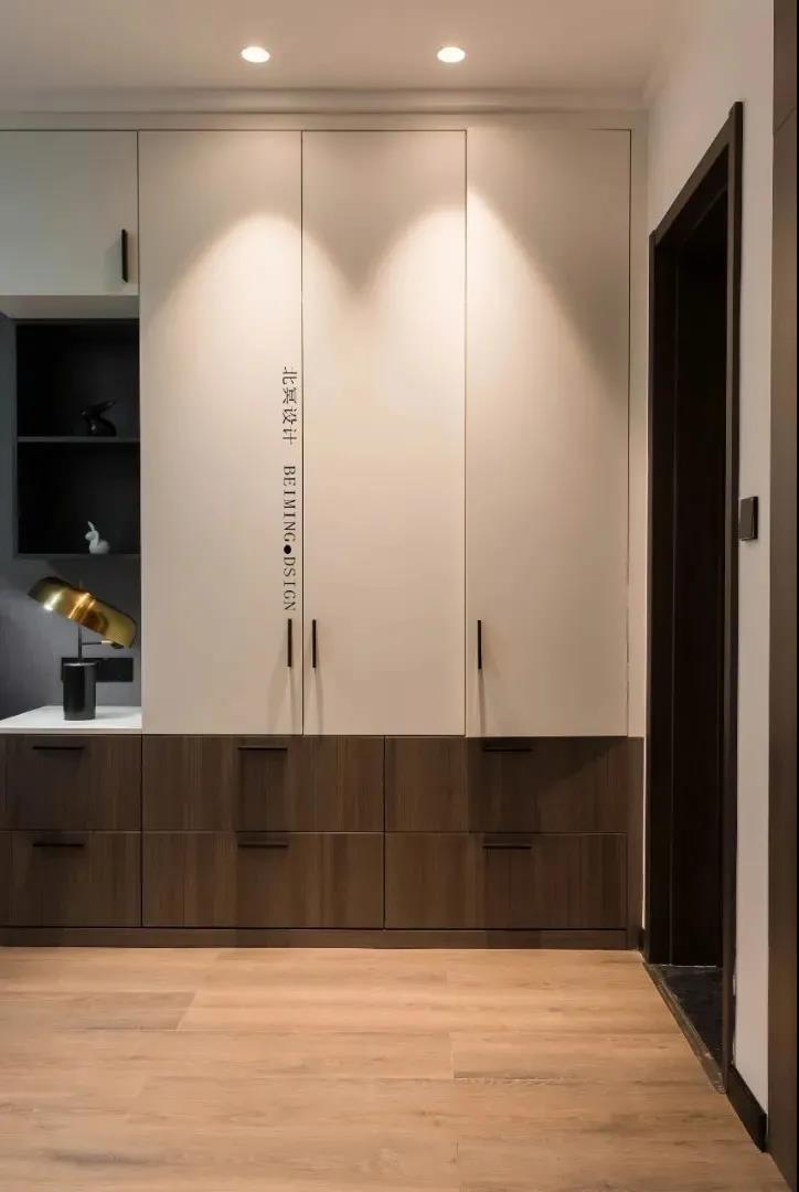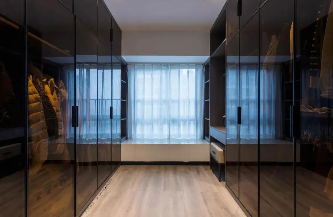 衣帽柜的玻璃面板,更显干练大气,多层的梳妆台让收纳更有序整齐。