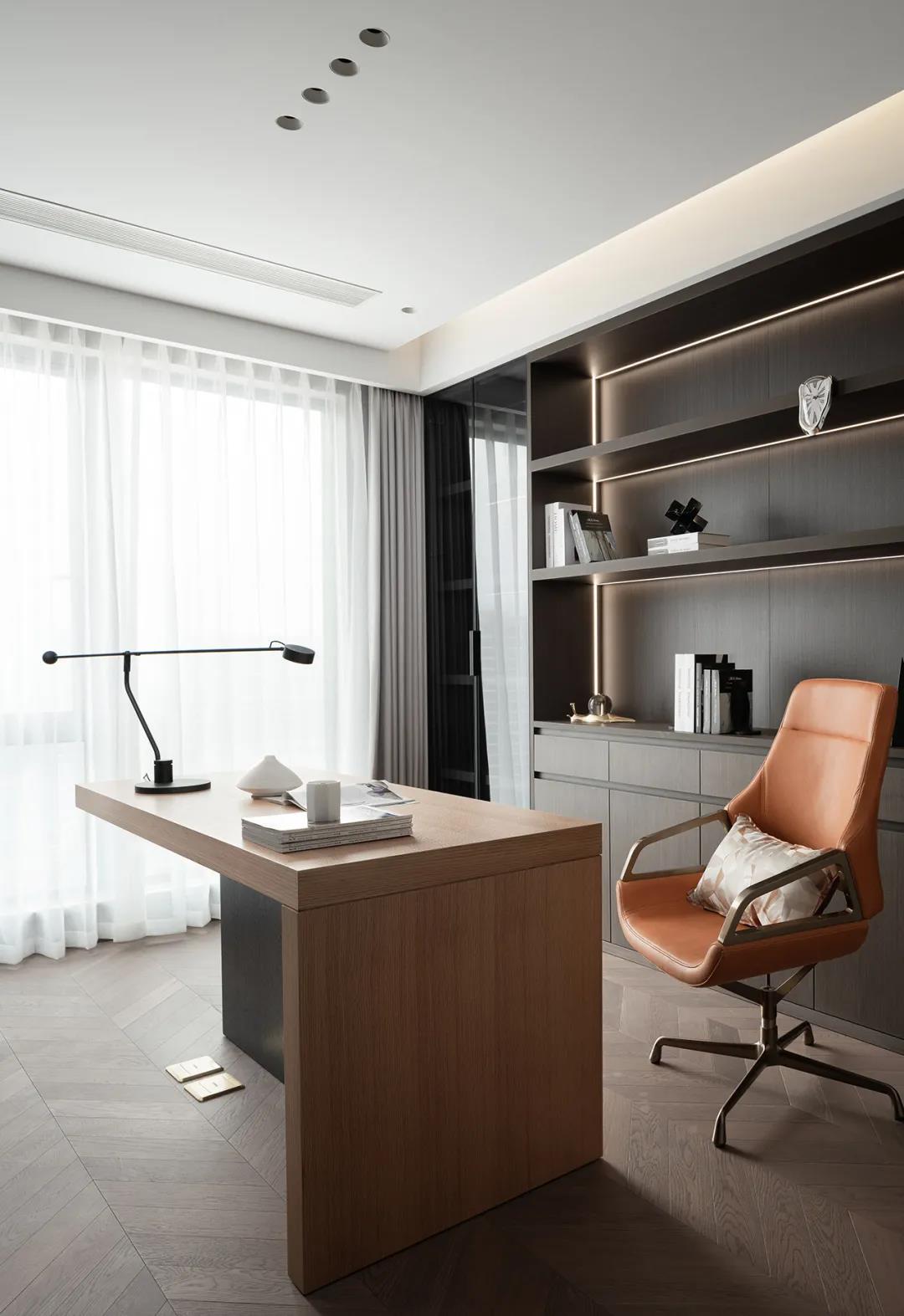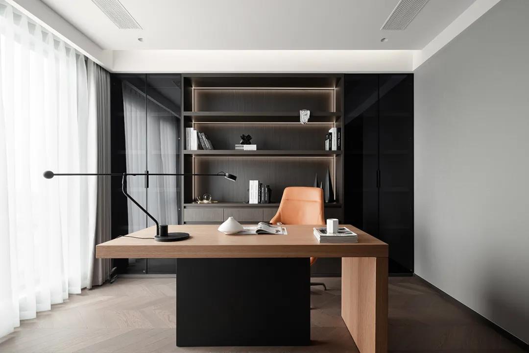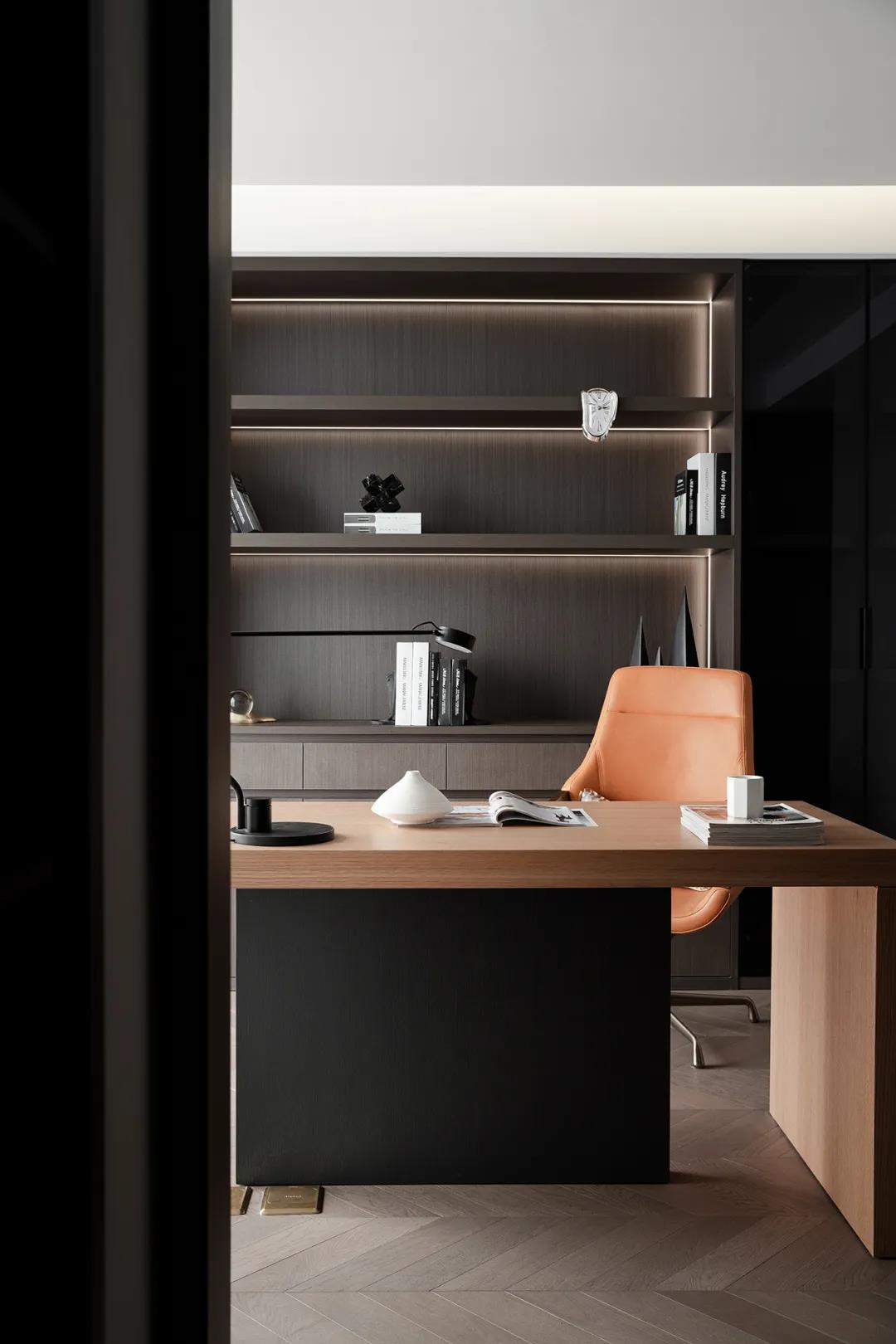 书椅的爱马仕橙,打破了原有的深灰色空间的沉寂感,让书房的活力得到了绽放。