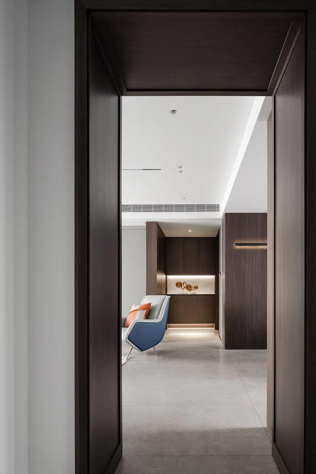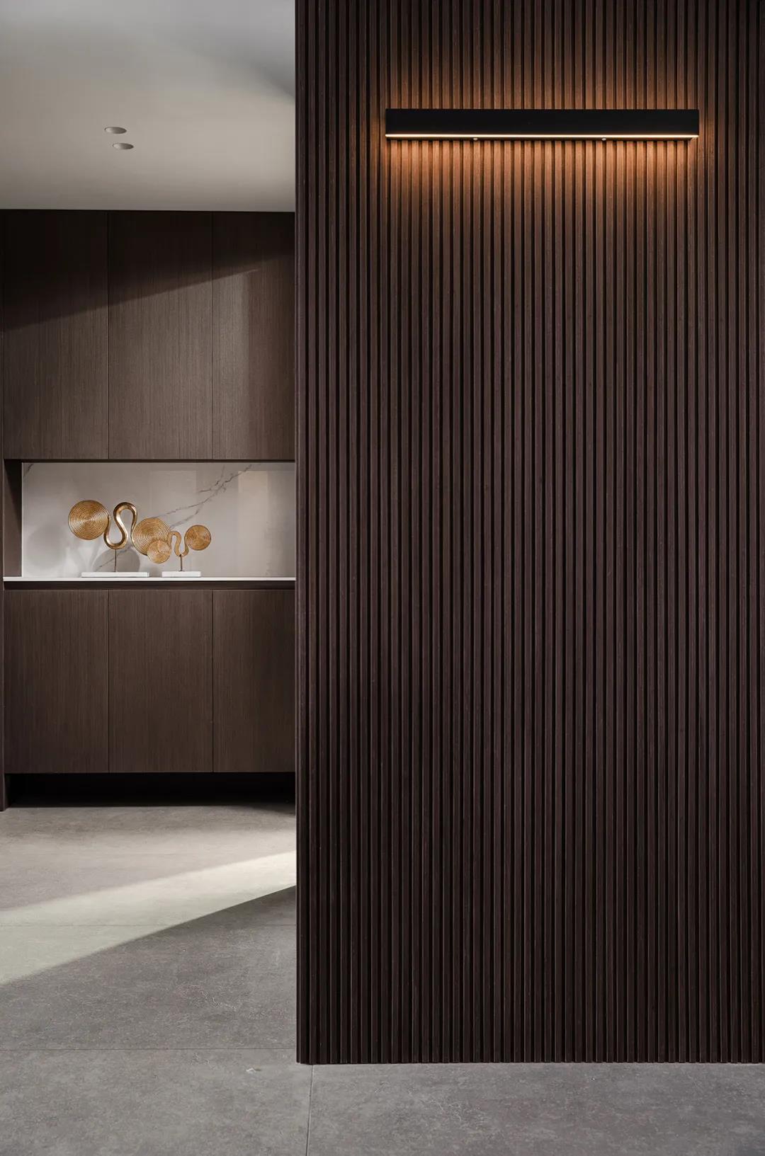 木饰面跟过道,利用简单分割营造视觉上的清爽感,另一面是置顶的内置冰箱柜体与透明的酒柜,与客餐区整体墙面设计遥相呼应。