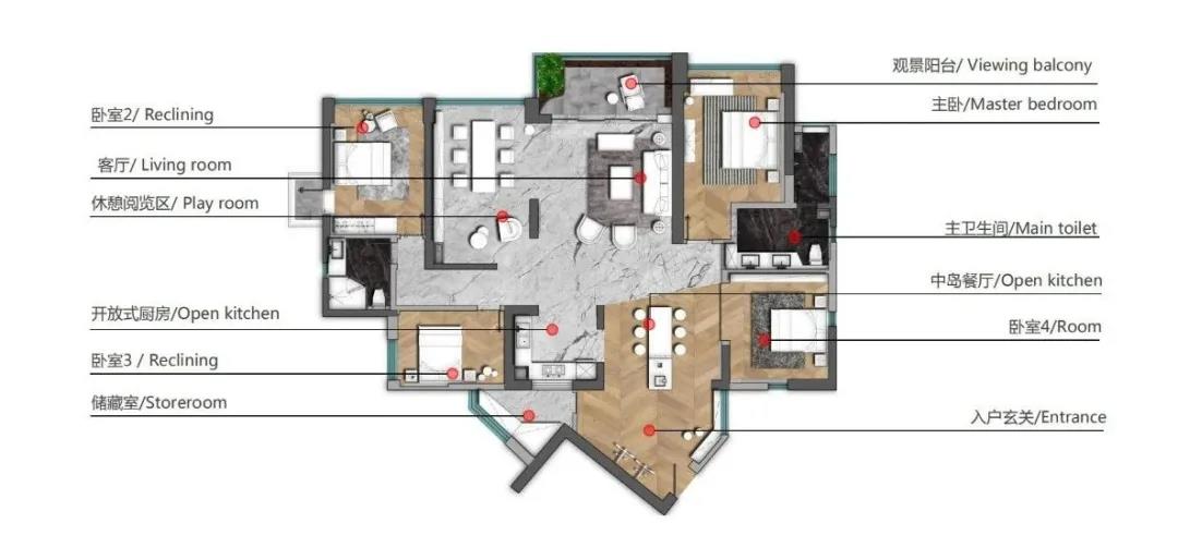 作为客户的度假用休闲空间,希望能为业主营造一个全开放的公共区域。所以在布局上把原有的客厅、餐厅、厨房、书房全部的打开,重新交错的伸展布置在空间里。有着开阔性和通透感。