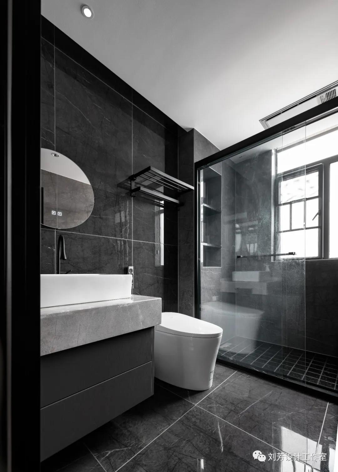 卫生间的墙地所应用的材质,纹理光泽丰富了空间的层次,让空间极具艺术氛围,时尚、大气的感觉扑面而来。