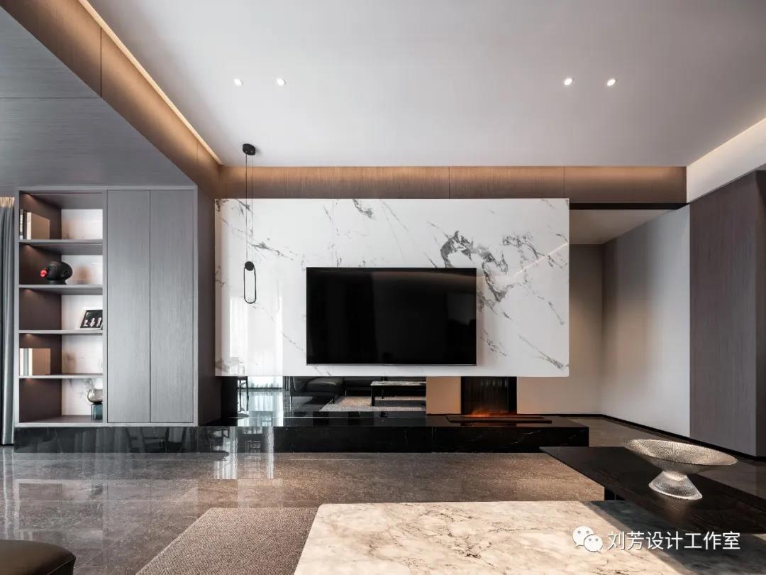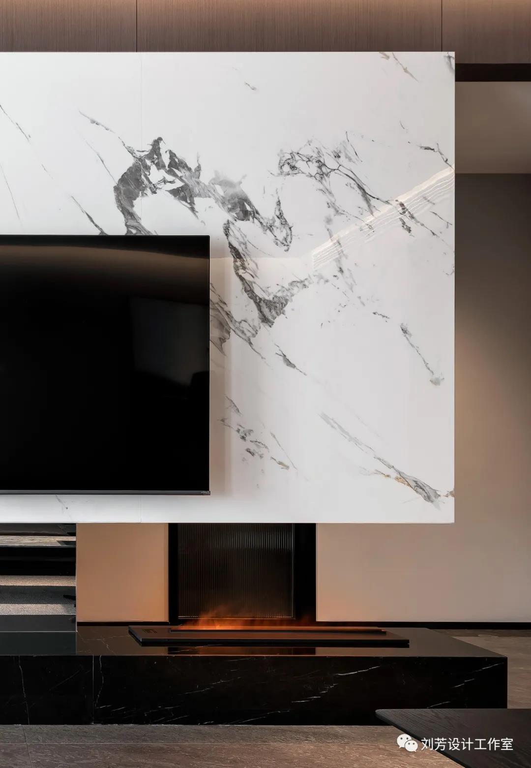 悬浮白色石材背景,黑色大理石地台,仿真雾化壁炉,阳光的倾洒,室内氛围自由流动……从色彩、功能到材质、配饰,都以一种张弛有度的空间方式呈现出来,内容丰富而细腻,有序而美观。