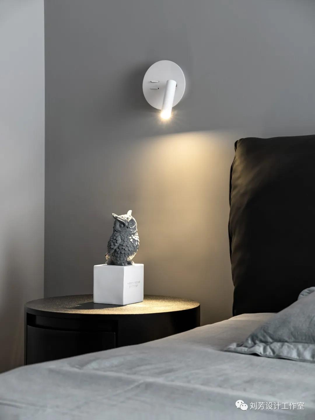 材质与色彩的灵动变化,又将不同生活场景的需求契合生动演绎。床头灯挥洒的克莱因蓝饰品,暗夜中的猫头鹰摆件,让空间呈现出一种神秘的色彩美学。