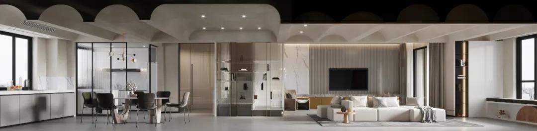 餐厅的顶面原先便存在非常多的梁,做平吊顶就会非常的低,为了弱化它,做了几个小拱形的吊顶。