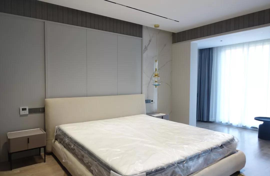 主 卧 室主卧室设计延续简约调性,设计师让简约的严谨和时尚得以结合。