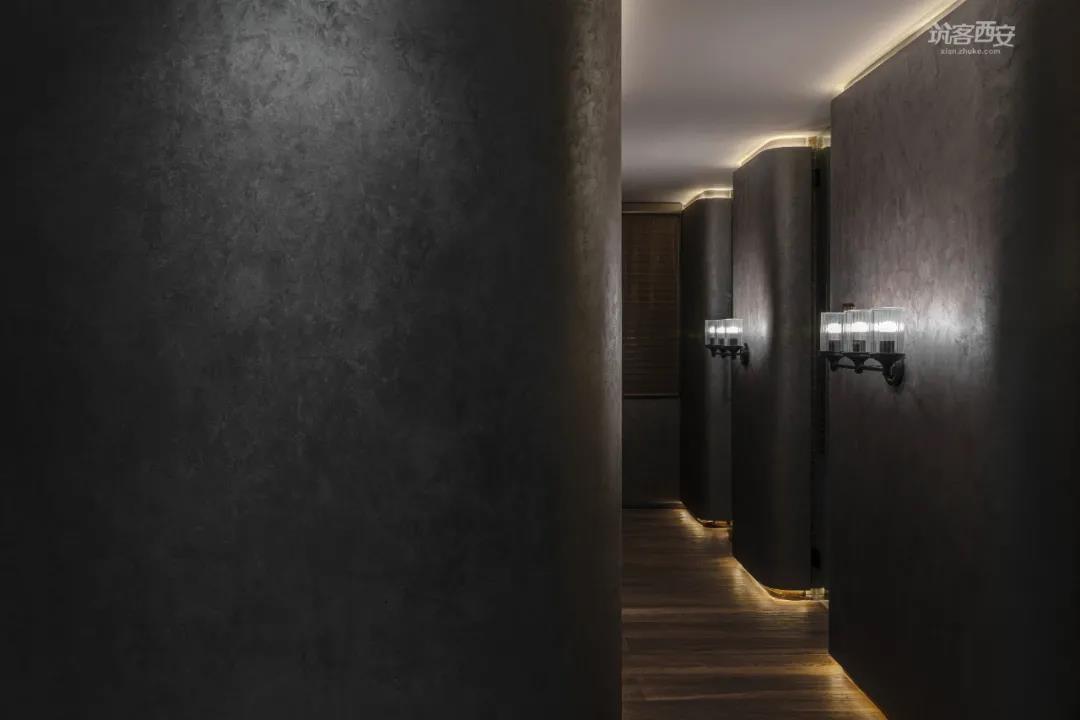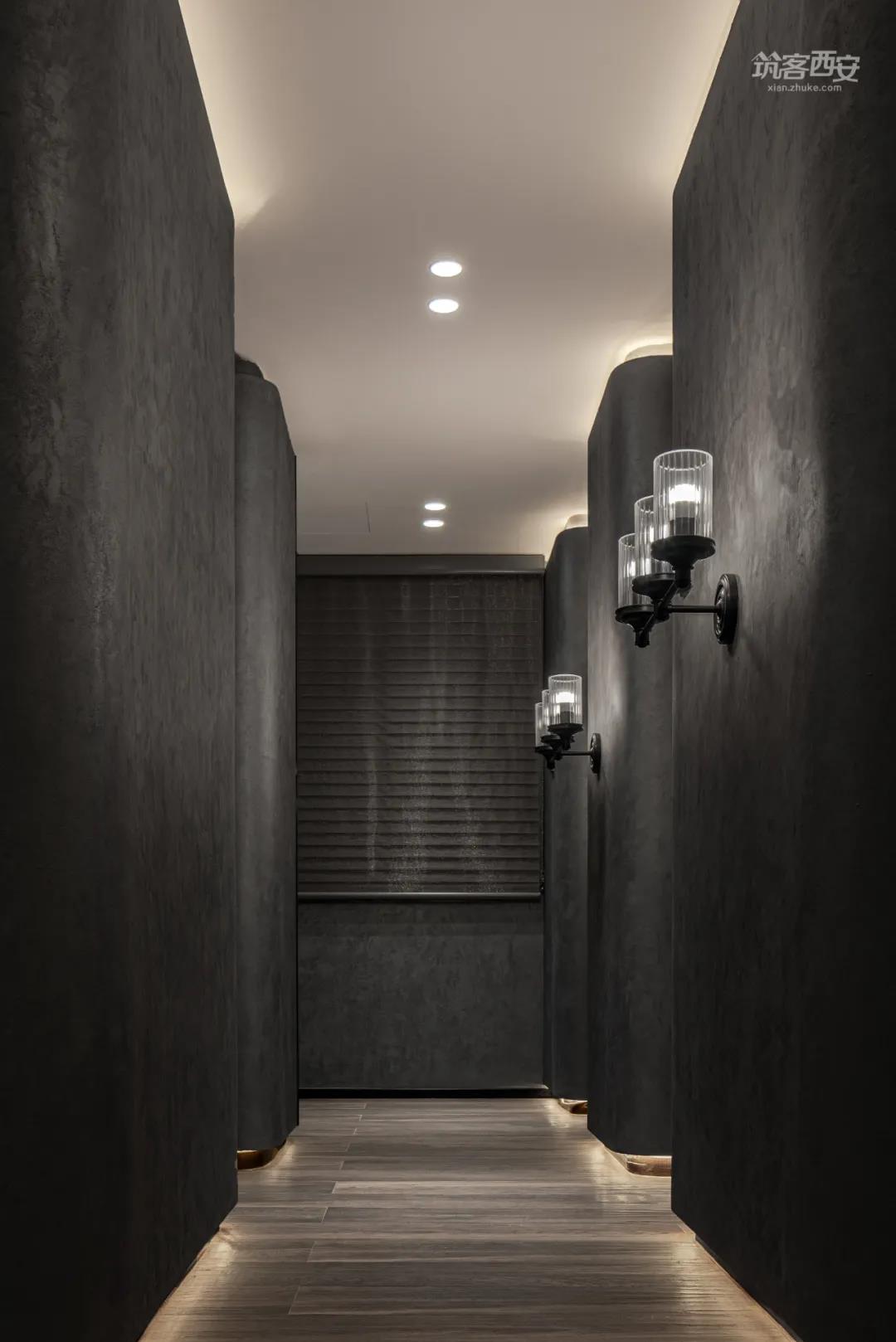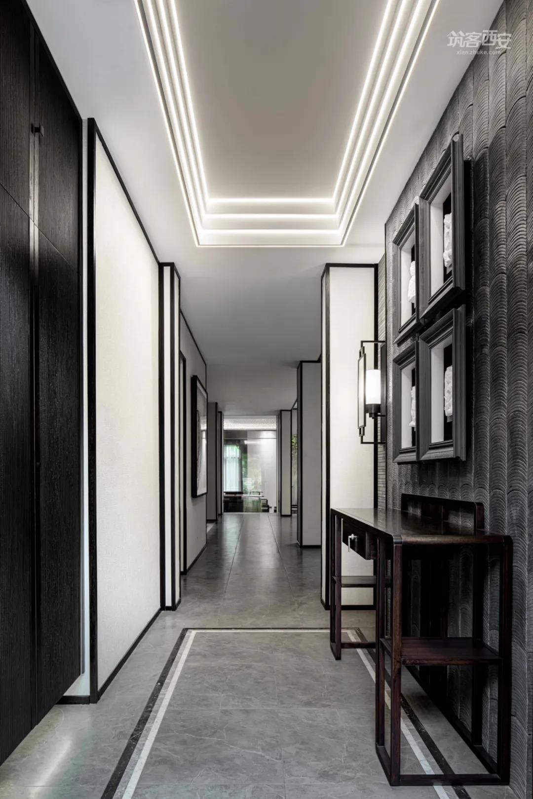 拾阶而上,黑色的条框收了所有的棱角,瓦的元素材料让廊间自然之下,层层错落的吊顶,承载了廊间的灯光强弱,让平凡无奇的走廊,也成为家里的设计亮点。