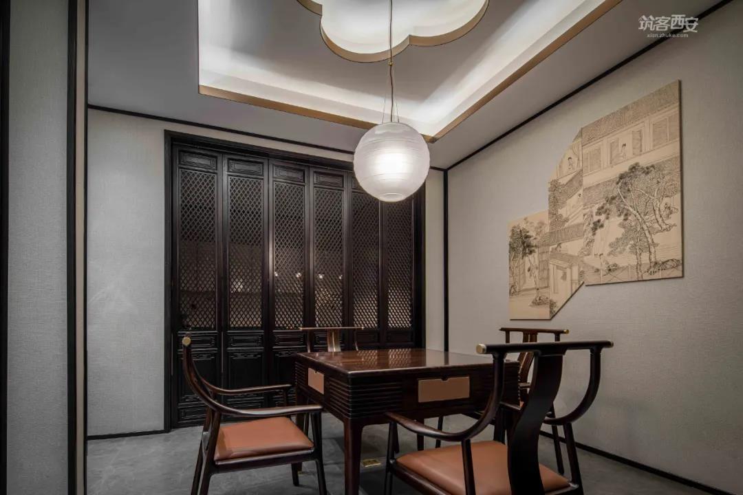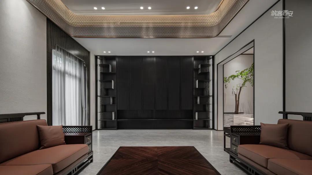设计师从顶面、墙面的互动关系设计上,将新中式的传统美与现代感营造出“心灵状态”,金属铜的质感贵气,高贵黑色纂花木纹,空间情绪从设计细节氤氲而出。