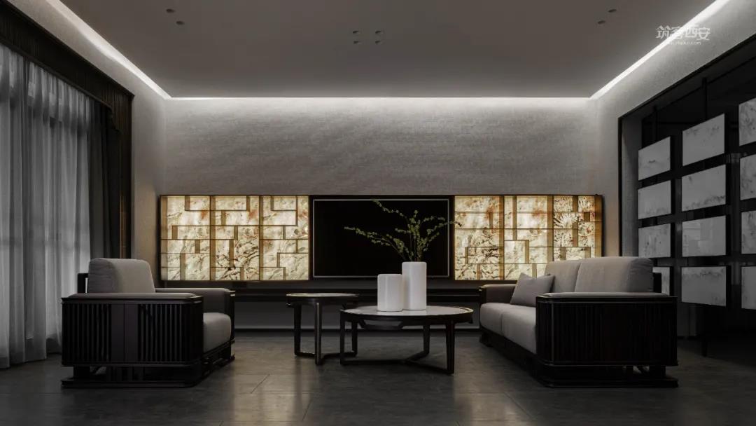 主要应用了“玄武石”系列、“卡拉拉”系列、“宙斯”系列、“北美橡木”系列等,打造典雅、温润、和谐的格调氛围,新中式的元素意境贯穿空间。