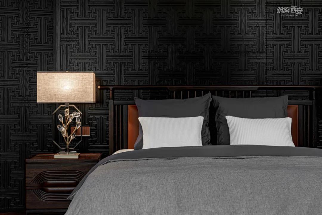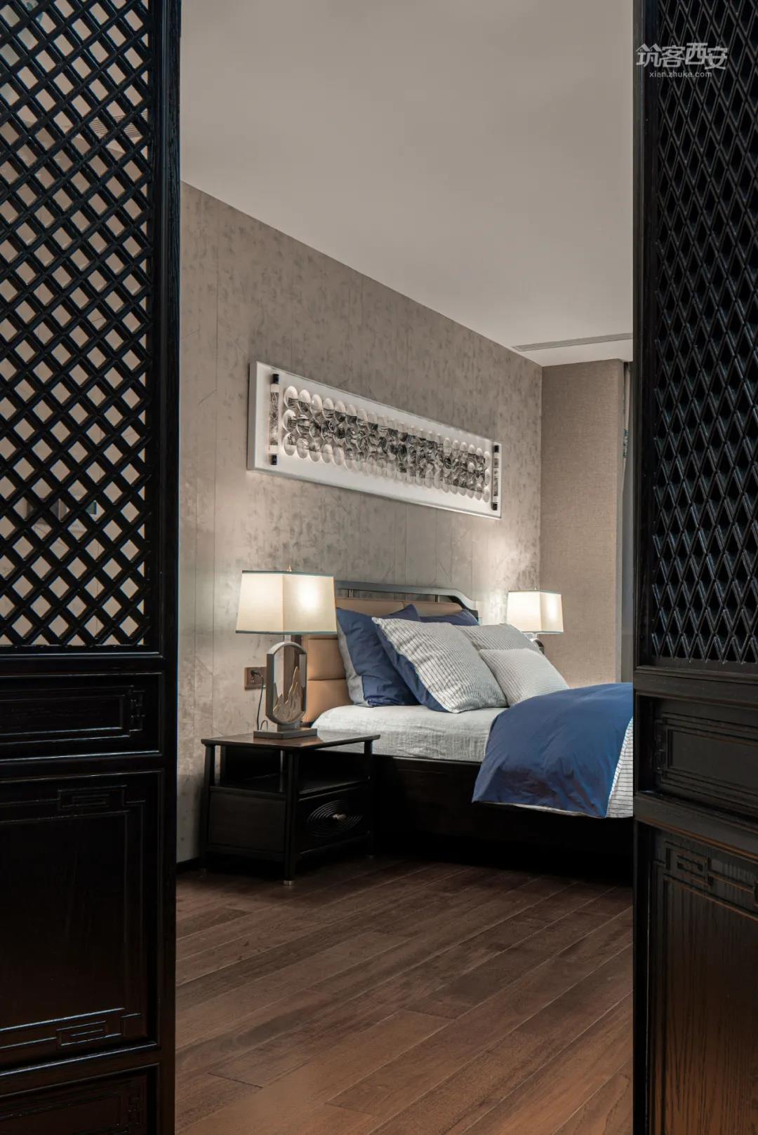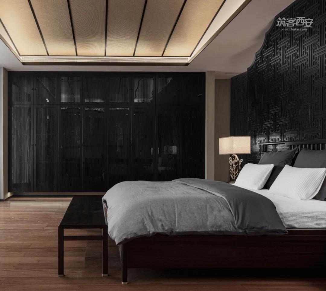 屏风的定制设计,依托了主卧的背景墙,亦营造了主卧的中式意境;书香扉页的坡顶设计,黑色紧密的现代四隔扇门,保证了私密和隔音效果;主卧区域半遮面,得一日安眠。
