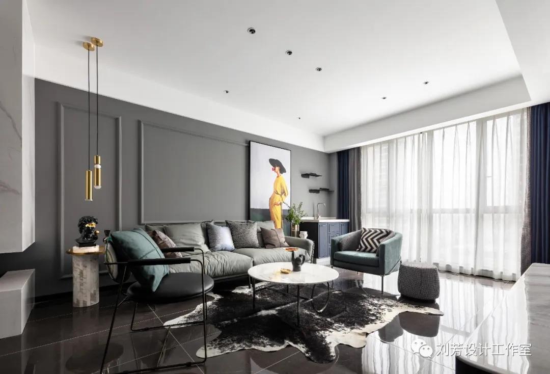 色彩上,客厅以冷静的高级灰为基调,沉稳的藏蓝色作为主色调引导空间情绪,选用层次感丰富的黄色作为跳色,搭配黑白皮纹地毯和抱枕,打破空间的沉闷,为空间增加了时尚摩登的气息。