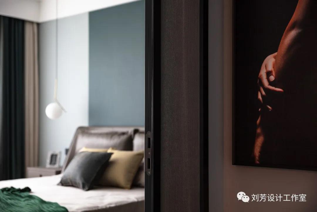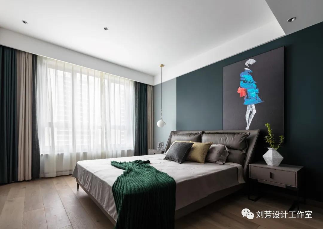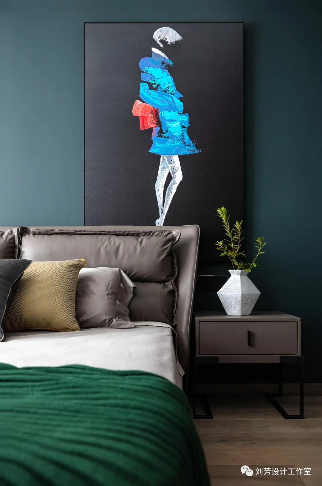 主卧以蓝绿与灰色的拼色墙面、抽象的人物挂画、白花瓶绿植、墨绿披毯……填充打造。