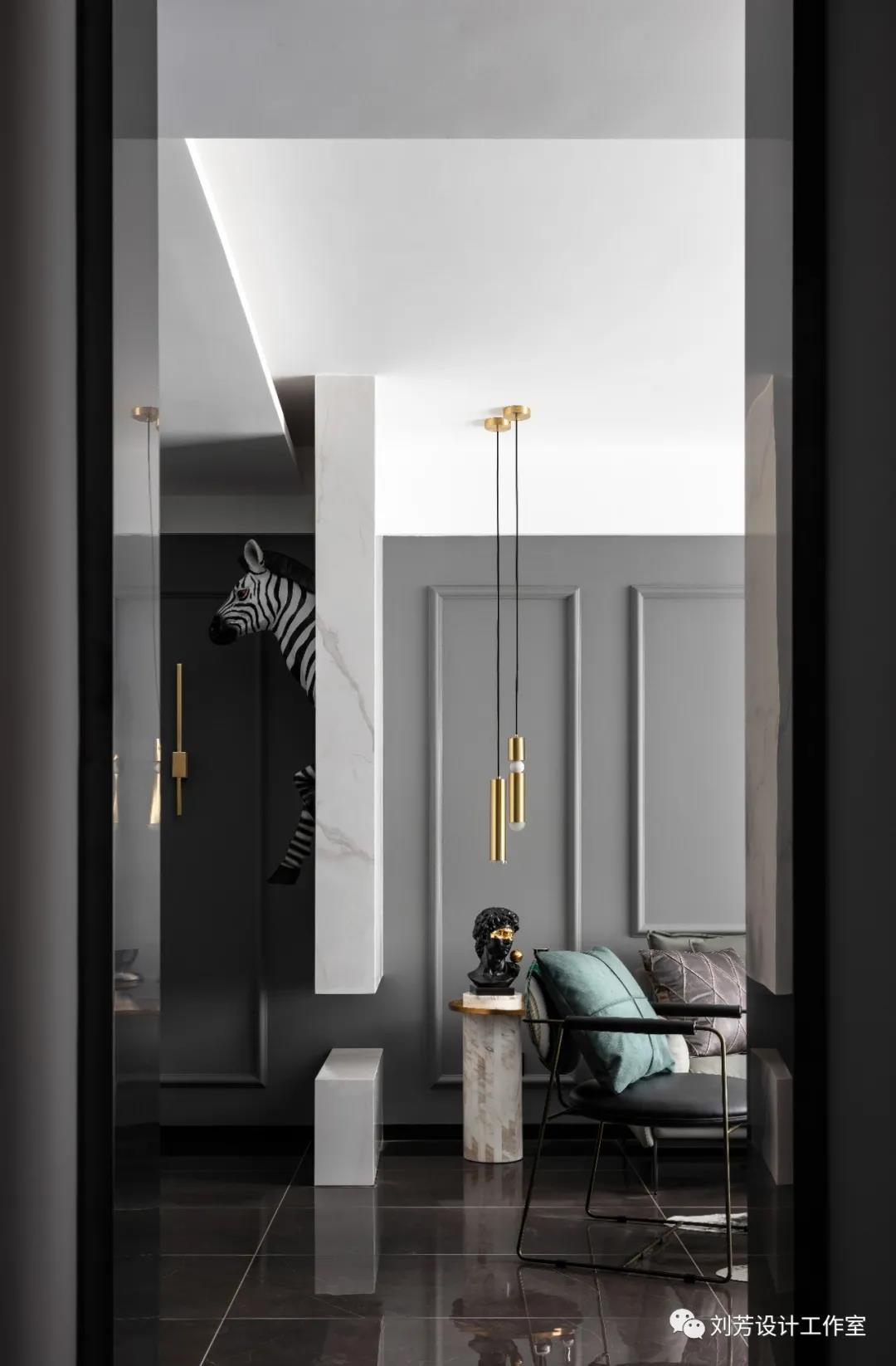 在进门客厅隔断墙面上选了一个脱缰而出的斑马挂件,给原本生硬的石材墙面带来一些视觉冲击。