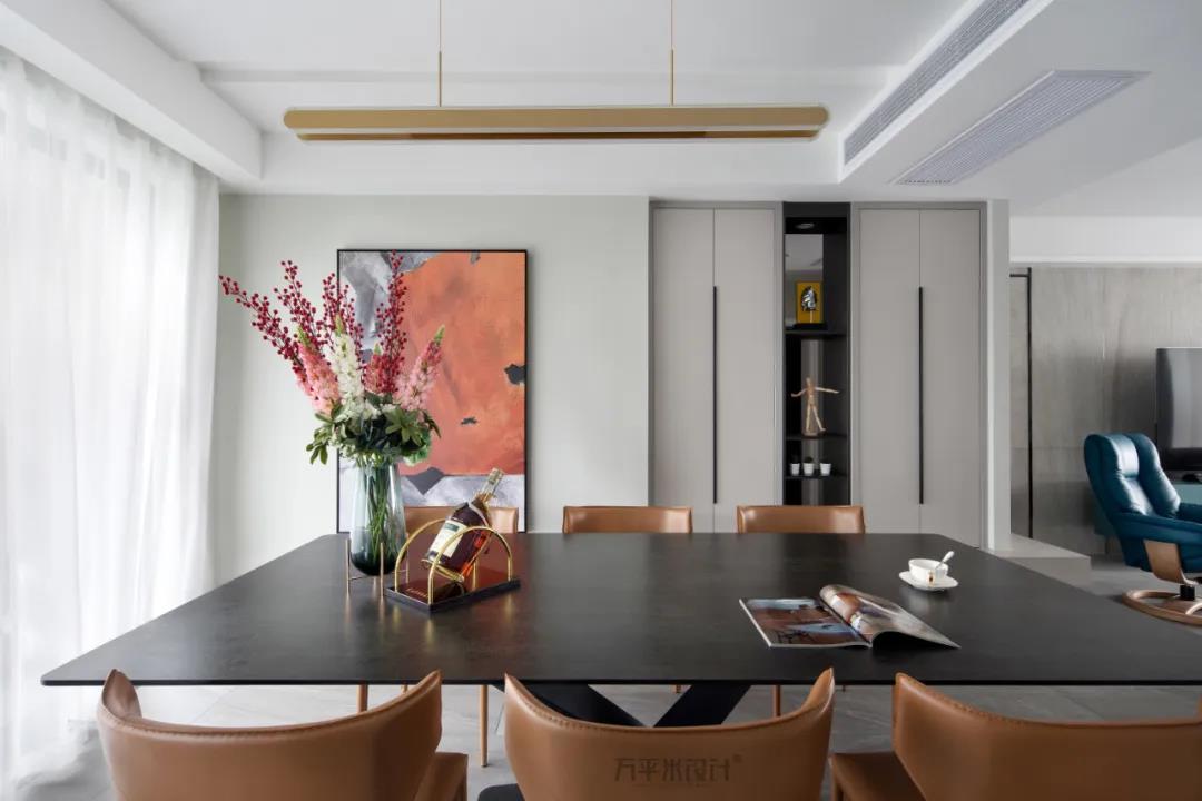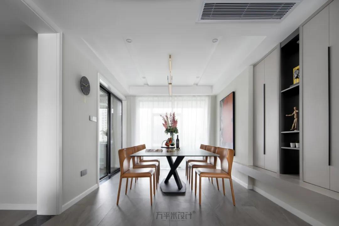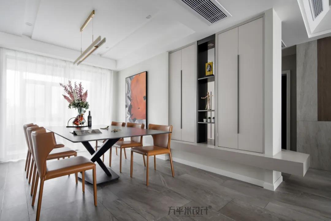 餐厅面积依托玄关墙得以扩展,延展毫不设限的生活尺度,宽大的餐桌因此游刃有余,足以容纳亲朋好友聚餐的需求。