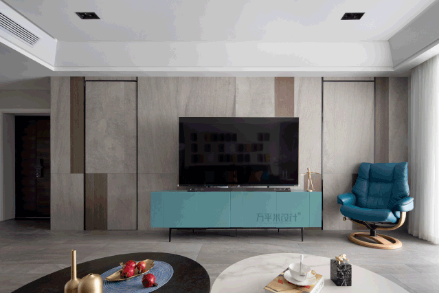 挪威蓝的维鲸单人沙发,高低错落的黑白茶几组合,在“宙斯”系列中性色调的包容下带来平静温和的轻松感。