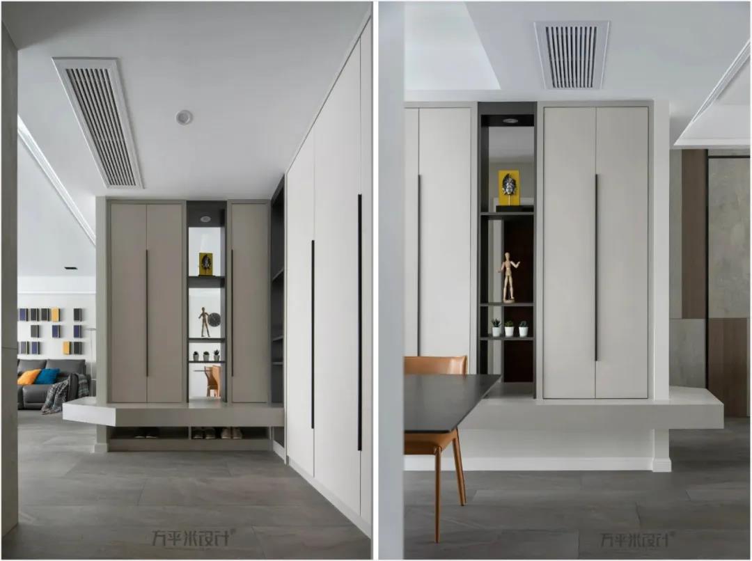 一般,现代设计是为空间做减法,而在本套案例中,设计师在后记中提到:给布局做加法设计,在宽敞的空间中巧筑储物柜形式的隔断,打造出独立的玄关空间。在加减之间,重新解构出舒适合宜的室内布局。