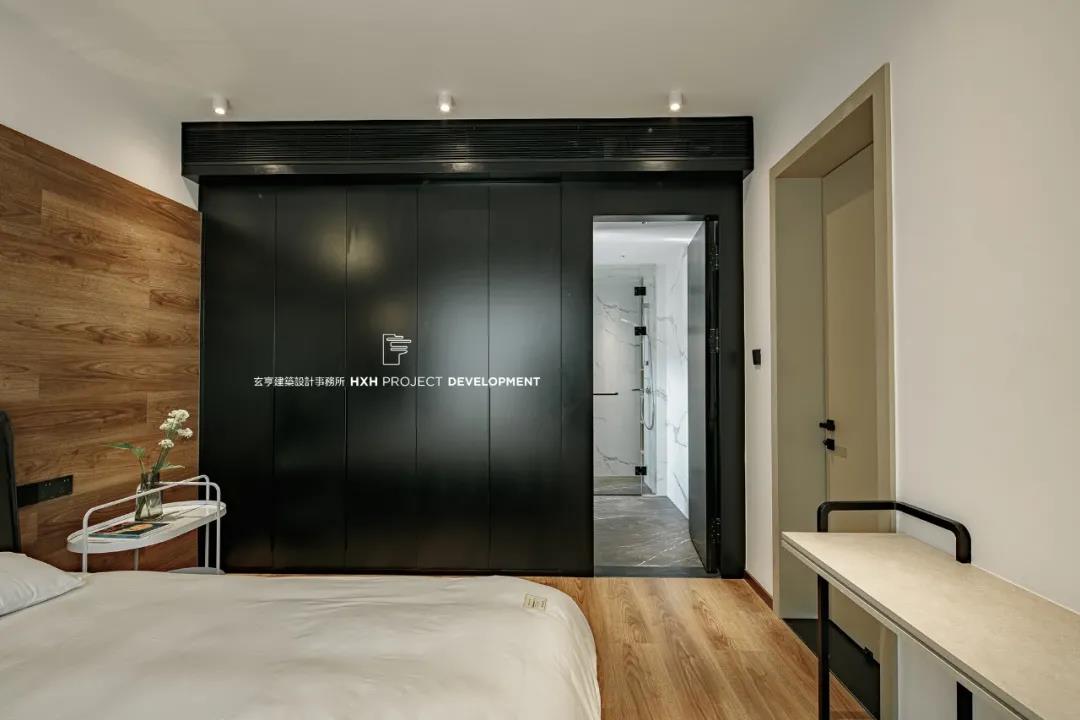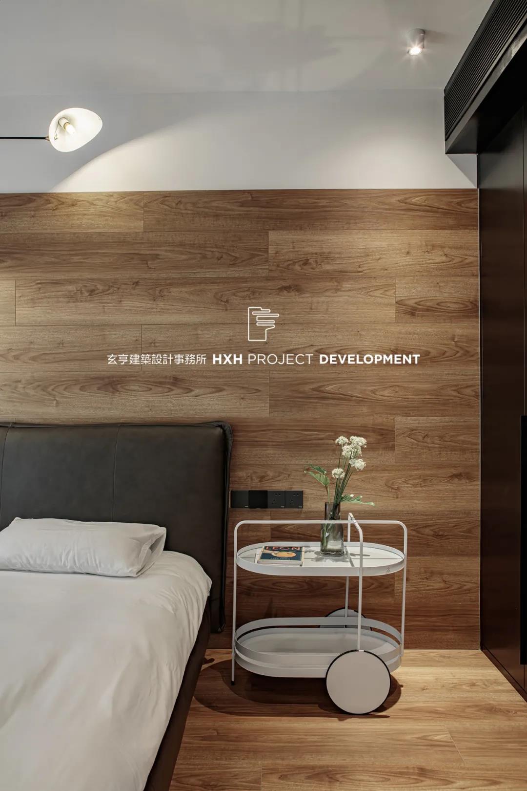 卧室墙面与地面同款材质,在视觉上将空间扩大,木纹提升了整个空间静谧平和的感受。