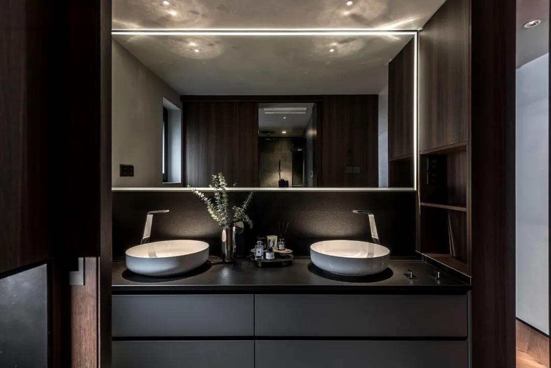 在私人空间营造上,结合另外两间卧室以及两个卫生间,划分出业主的休息空间以及步入式衣帽间空间,再把现有两个卫生间整合成一个干湿分离的卫生间。
