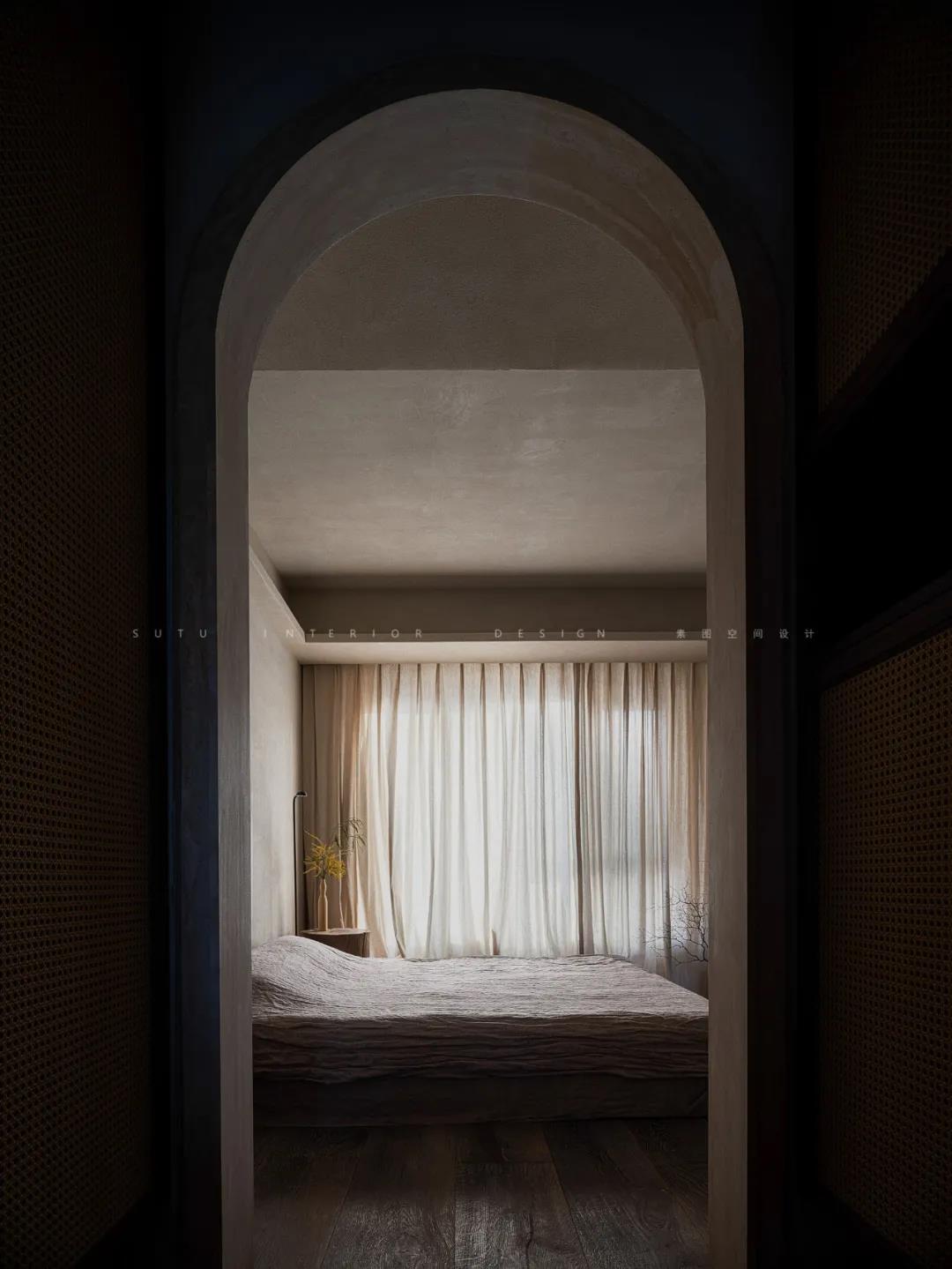 主卧搭建了地台,在形式上对空间进行划分,也可以起到一定防潮作用。空间中软装的搭配、窗帘的选择、色调的把控都很好的营造出了简洁朴素的空间氛围。