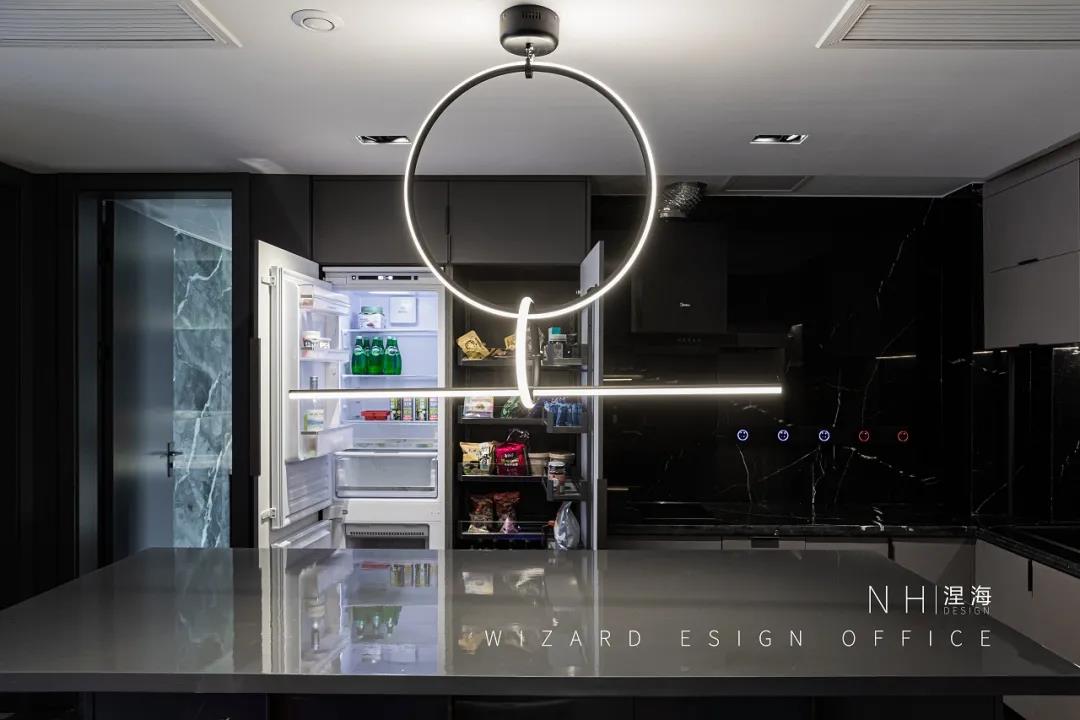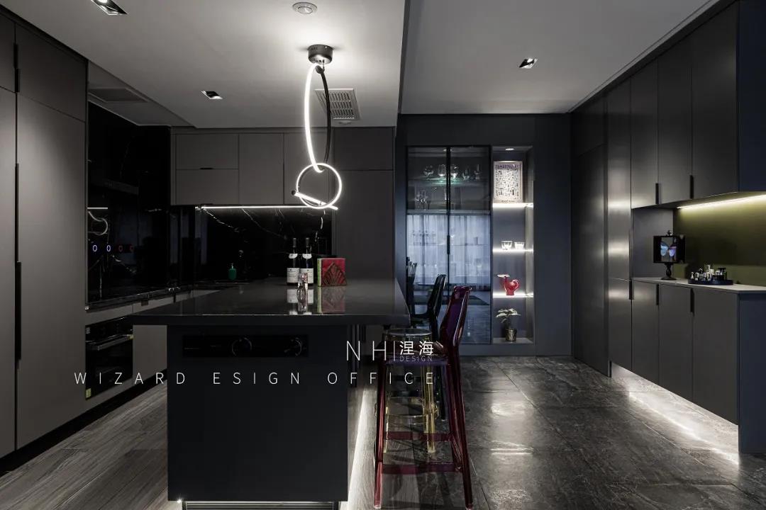 开放式厨房,个性吊灯散发着情调的光影,适合与朋友小聚,顺便再开一瓶红酒的那种。
