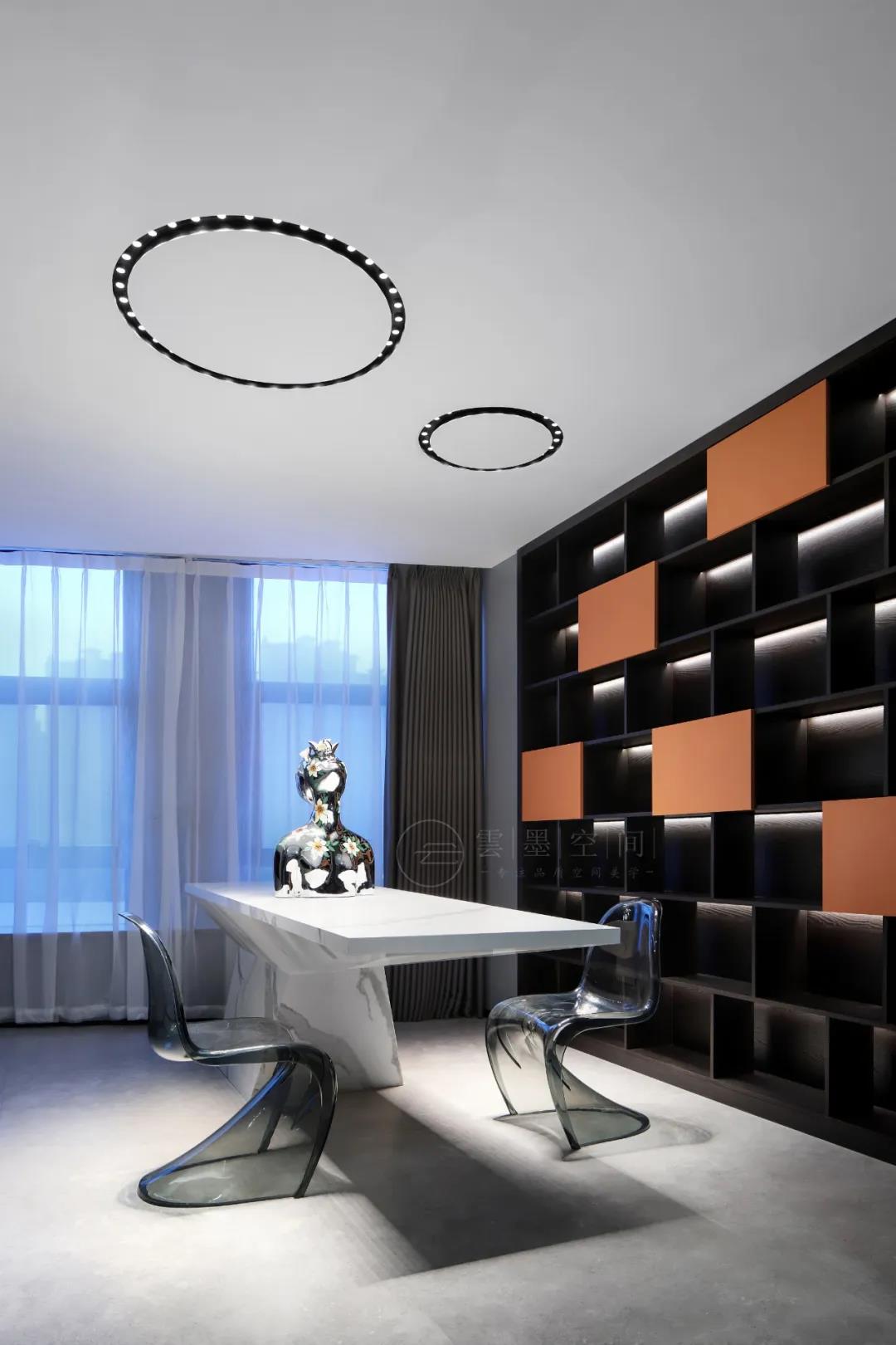 因此,空间以黑、灰等能令人心情平静放松的素色为主色调,饱和度高的红、橙、蓝以色块、软装等形式点亮设计,于简约中,透露现代时尚。展现空间与人的对话,赋予空间更多遐想。