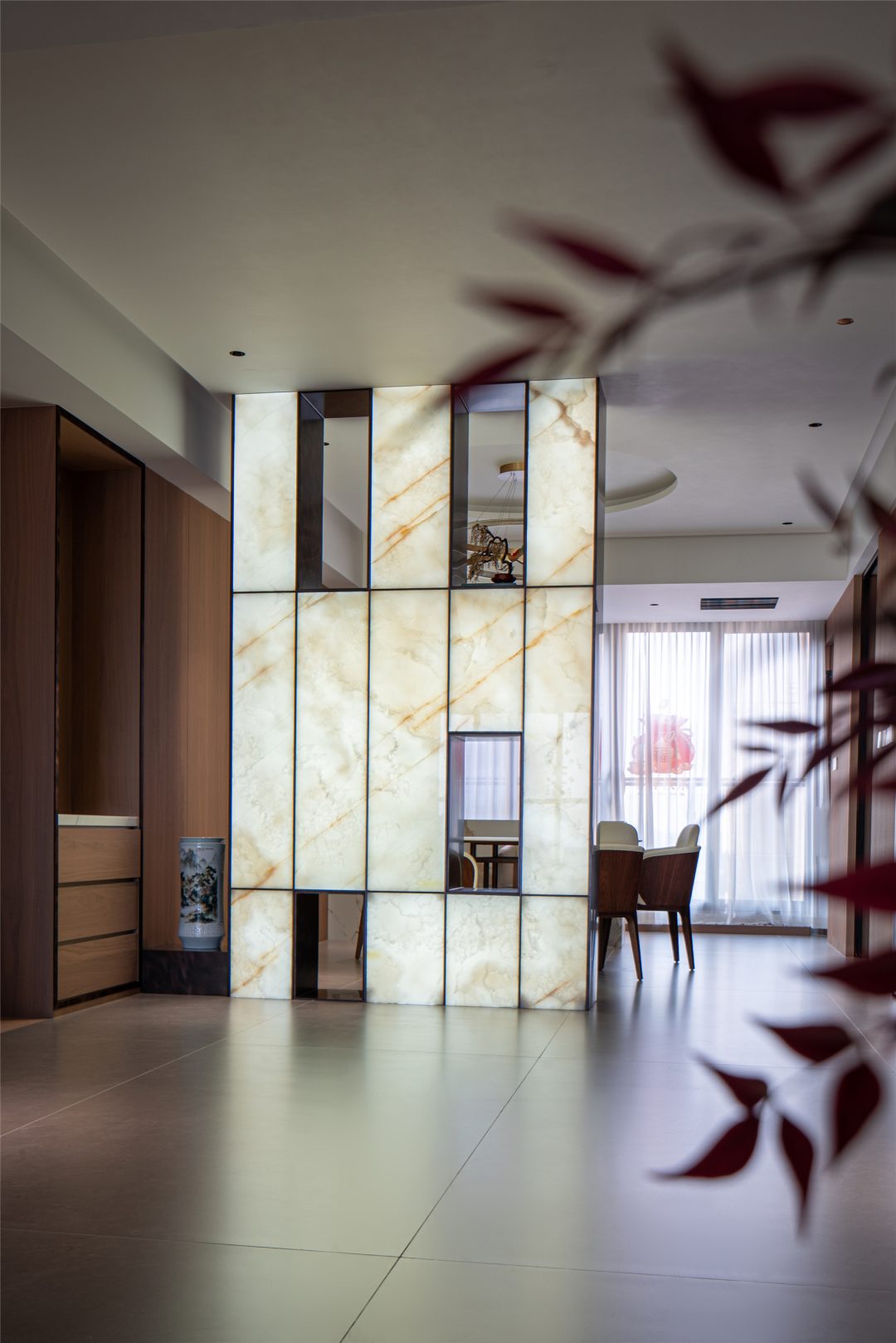 △ 考虑采光延伸以及光照的效果,设计师选用不锈钢+透光石屏风作为隔断背景,镂空的设计也是别有用心。