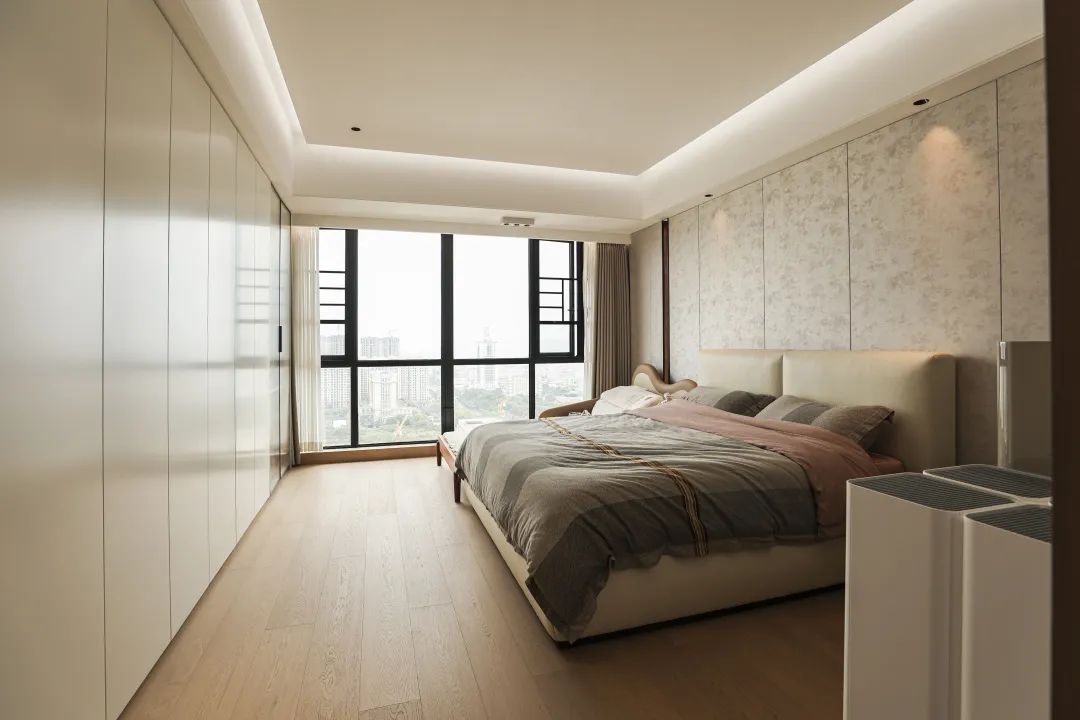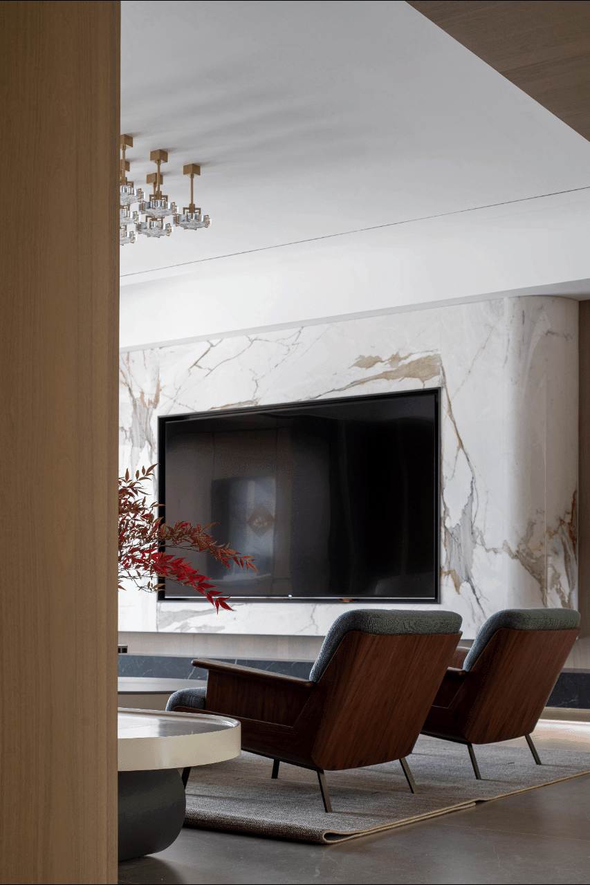客餐厅通铺1200*2400mm的欧文莱灰岩板,自带暗纹,材质柔和,质感出色,结合整套家具、木饰面与石材相融合,公卫选用的墙地砖更显稳重、舒适的空间效果。