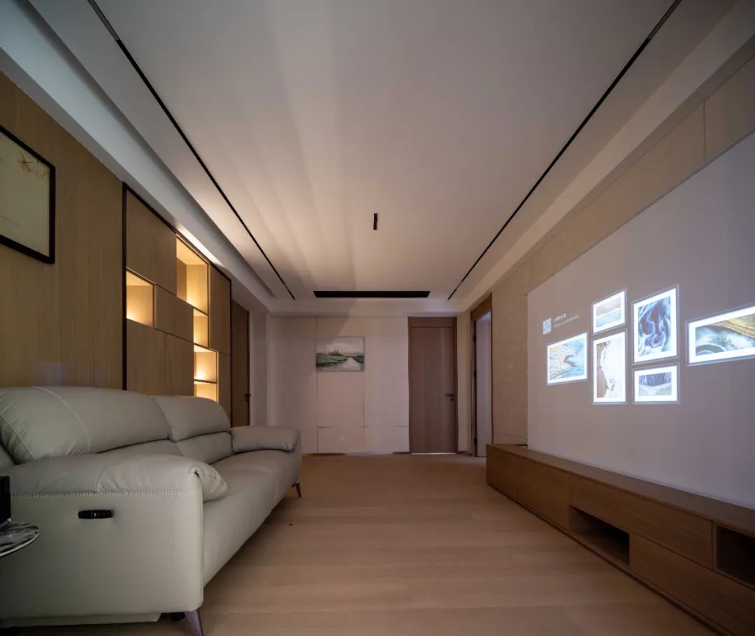 △ 此处原先有道剪力墙,考虑到美观与实用相结合设计成半开放的展示书架,同时加了透光,暗藏光为观影氛围加分。