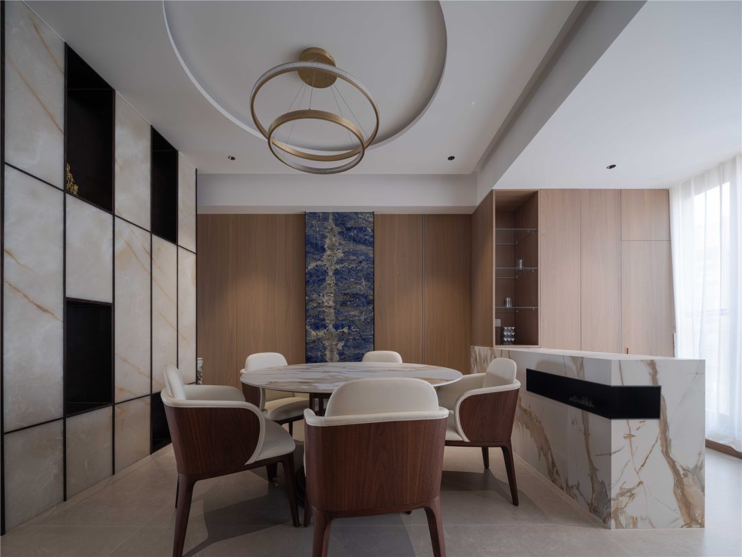 餐厅岛台的设计方便物品摆放,亦可进行日常简餐,同时巧妙设计柜体把管道藏其背后,在视觉上保持室内的整洁,嵌入式冰箱增加储存空间,客餐厨区选用的材质也是相呼应。