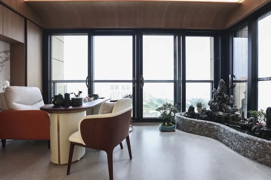 在公共区的范围划分了三大功能区,客厅兼有会客,茶室,观景阳台功能,中转展示区陈列屋主一系列珍藏品,以及整洁的餐厨区域。