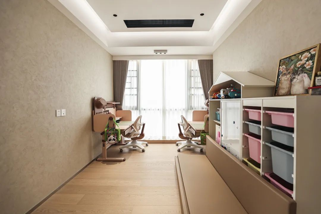 除了屋主夫妻两人的主卧外,两个不同学龄的小朋友也拥有个各自的房间,可以独立学习,也可以在活动区一起做作业、手工。