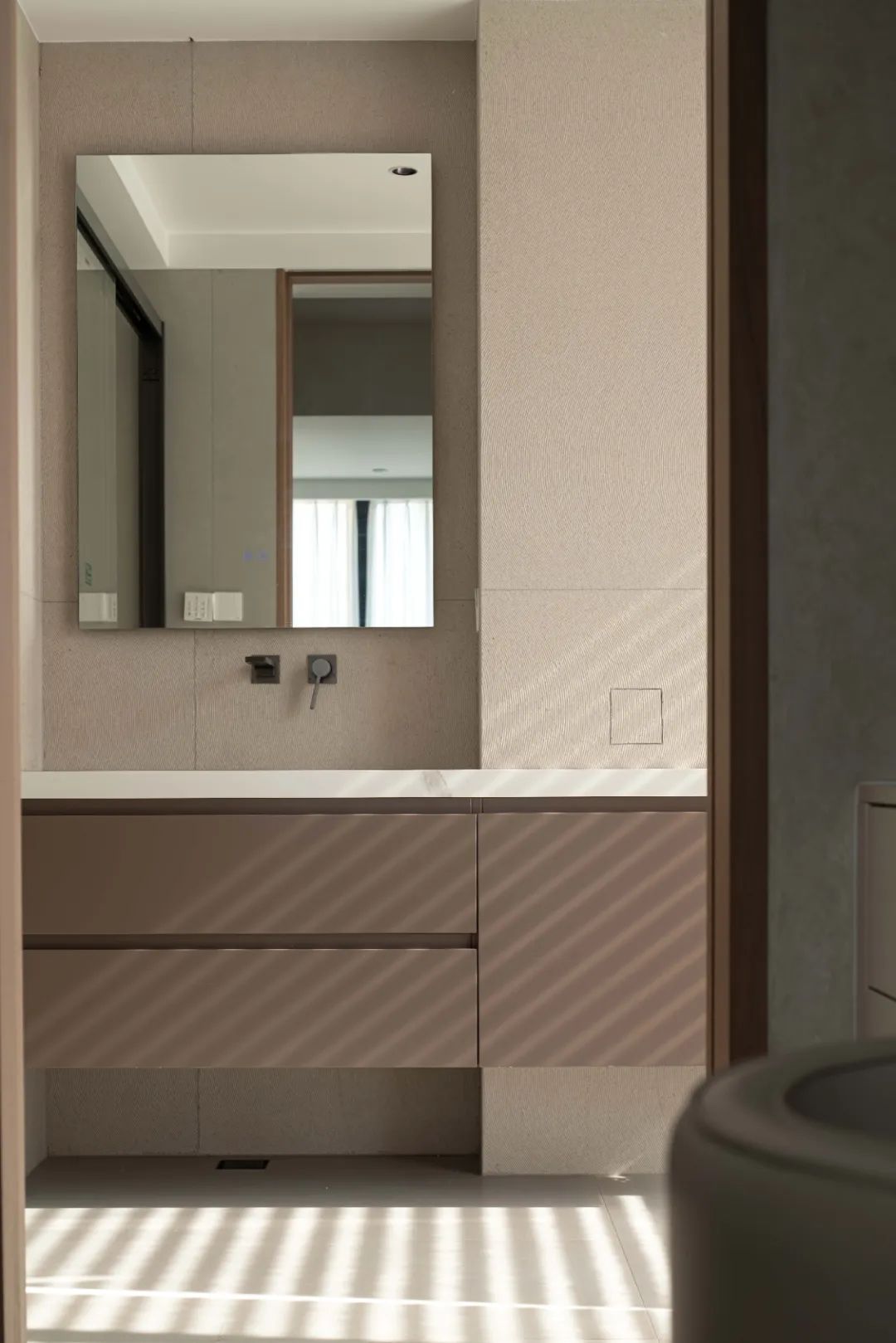 △ 公卫地砖铺贴欧文莱微水泥,回归自然的纯粹,自我本色更有腔调,质朴中不失高级格调;墙砖选用记忆曲线,柔和流畅的曲线肌理,展现了空间的延续感。