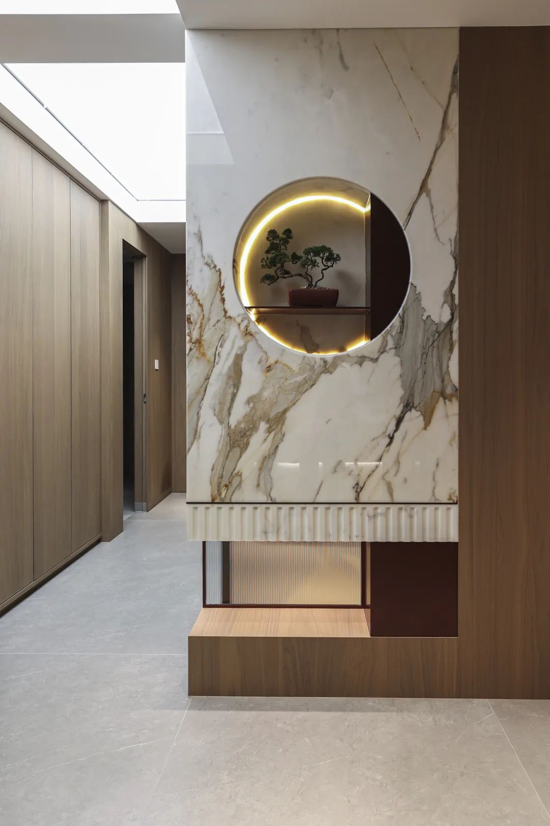 本案设计师主要从色调、灯光、选材进行考量,入户背景选用了天然石材鱼肚金与不锈钢、木饰面相结合,由于原先门厅光线较暗,为了拥有更好的空间感和采光,增加了带有灯光的氛围设计,使得整体明亮又大气。