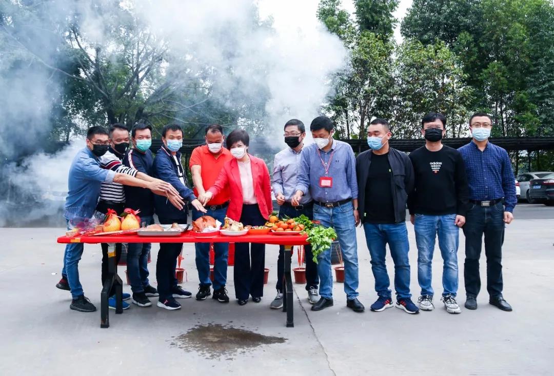 △ 广东欧文莱陶瓷有限公司董事长梁伟鸿(左5)、副董事长麦文英(左6)、执行总裁汪加武(左4)及一众出席了今天点火仪式的领导合影。