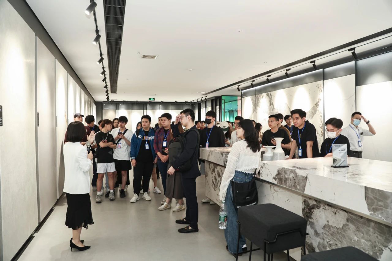 ▽ 来自俄罗斯、韩国、马来西亚、印度尼西亚等国家留学生代表组成的参访团,在欧文莱公司品牌营销中心策划总监文映人的陪同下参观了解欧文莱素色美学馆。