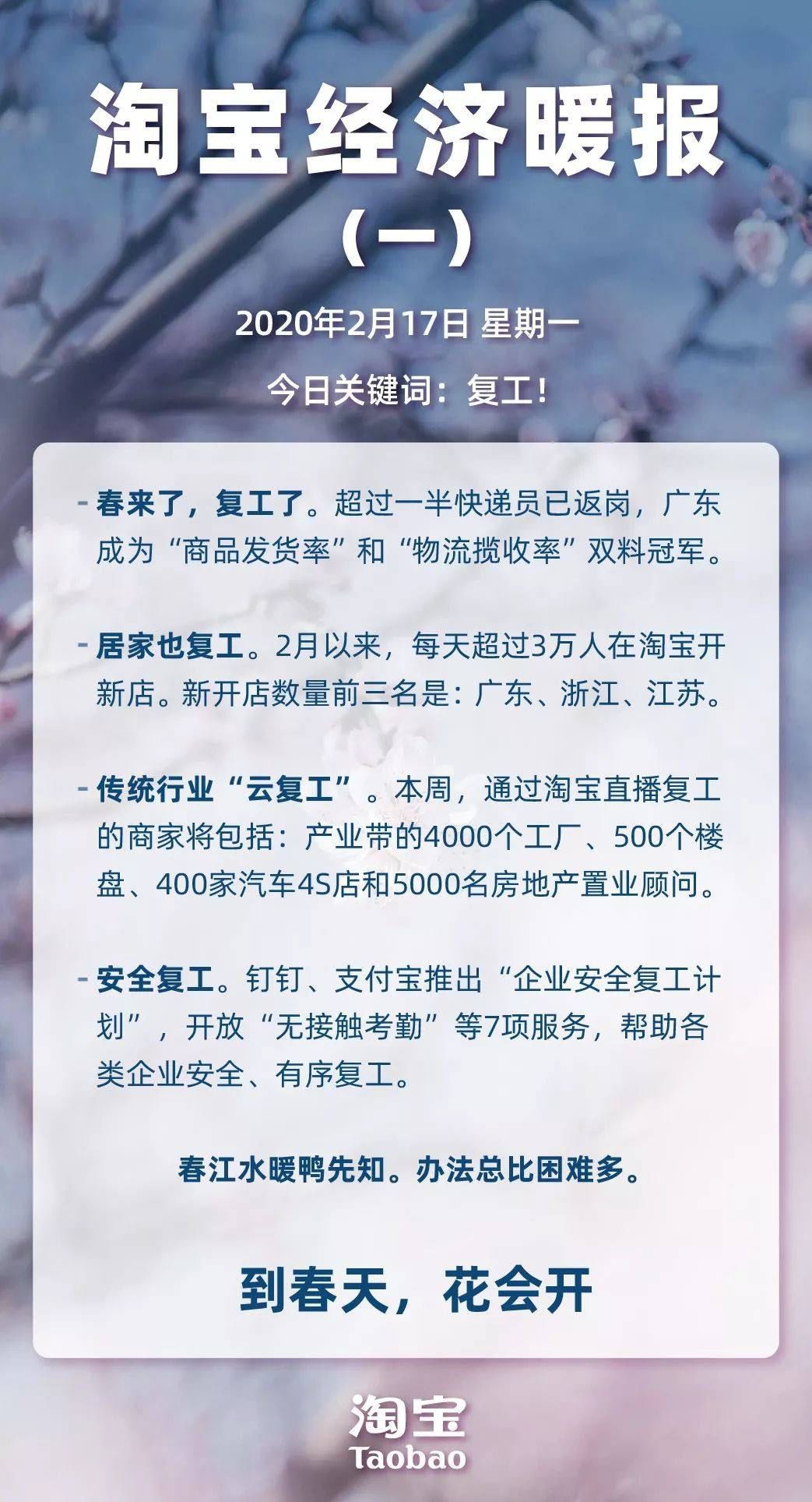 2020年,一场疫情打乱了一切,让很多原本在进行中的工作被迫推迟或搁置。 项目停滞、复工复产延迟…… 陶瓷行业史无前例地慢了下来, 令人始料未及。 但痛定思痛, 当零售、建材等传统行业 受到疫情打击陷入生存危机时, 直播电商等新零售模式 再次为陶企打开连接世界的新窗口。 因为即便在不能出门的日子里, 生活还是要继续。 比如上淘宝边看直播边给新家添置一套沙发, 或者心仪已久的瓷砖许久不降价, 但直播间的优惠令人惊掉下巴…… 此时不出手,还待何时? 2月17日, 淘宝发布第一份《淘宝经济暖报》显示: 各行各业都上淘宝复工了! 2月以来, 每天都有超3万人在淘宝开新店。 新开店前三名是:广东、浙江、江苏。