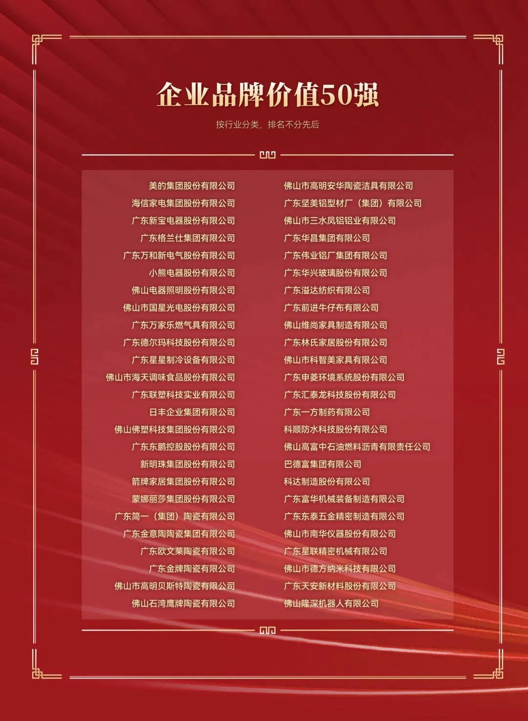 △ “佛山市企业品牌价值50强”榜单依托中央财经大学统计与市场调查研究中心、佛山市质量品牌发展协会等机构,依据《品牌评价品牌价值评价要求》(GB/T29187-2012)、《品牌评价多周期超额收益法》(GB/T29188-2012)以及品牌评价相关行业应用指南等有关国家标准,对企业品牌进行货币价值测算和评价,根据测算结果出具评价报告。