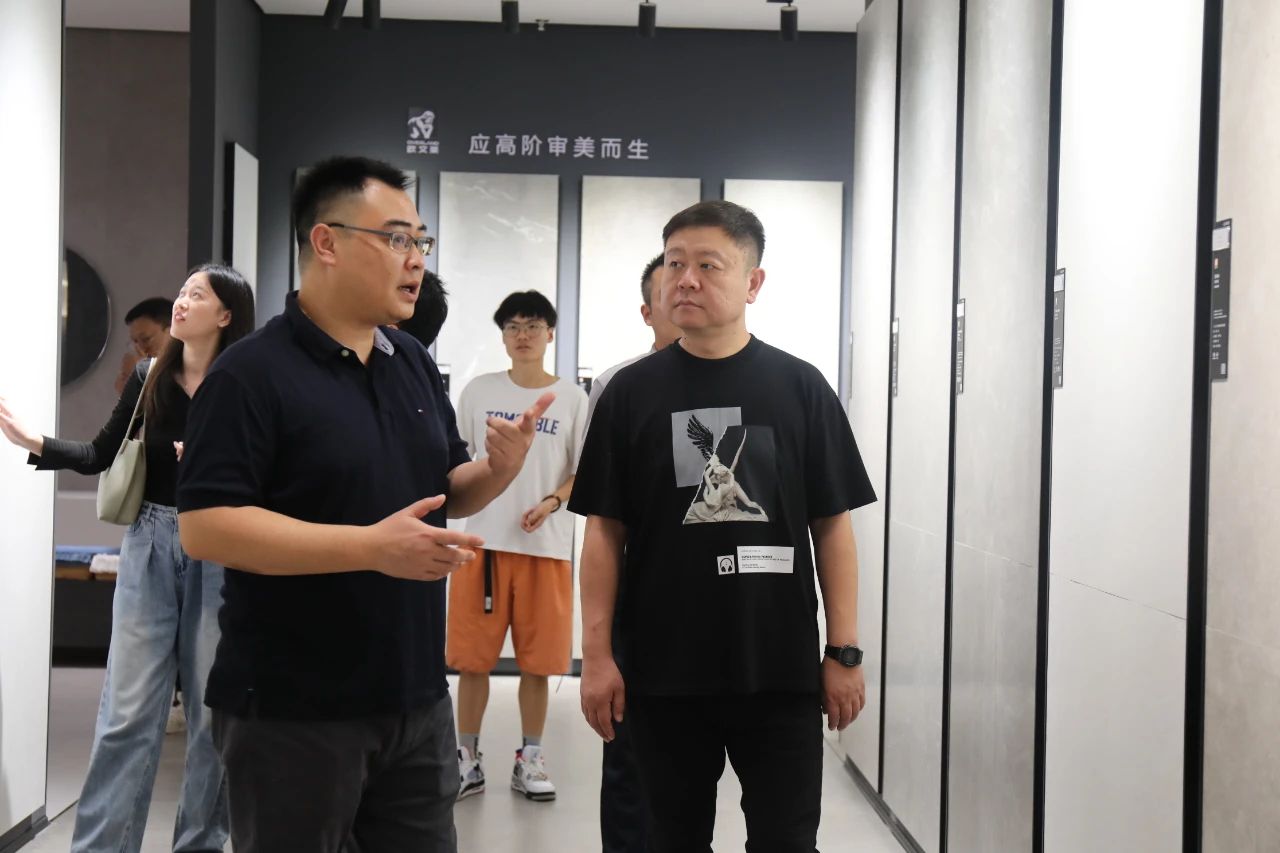 ▽ 欧文莱加盟商中心总经理刘颖、欧文莱加盟商中心中区负责人林毅、荆门欧文莱总经理张冰泉向沈劲夫老师讲解欧文莱荆门高级体验店,分享素色美学感受