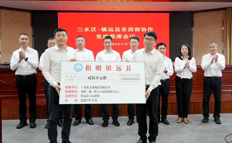 欧文莱积极响应佛山市三水区对口帮扶镇远县东西部协作工作,加入乡村振兴队伍,发挥陶瓷产业正向作用,用实际行动彰显企业担当和积极向上的精神面貌,向镇远县捐助价值200万元的建筑用砖,为乡村振兴有效衔接贡献力量。