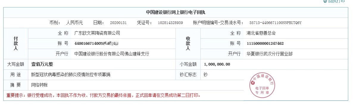 佛山日报讯 记者陈梦报道:“付款人:广东欧文莱陶瓷有限公司”“收款人:湖北慈善总会”31日,再有三水企业捐款支持新型冠状病毒感染的肺炎疫情防控工作。广东欧文莱陶瓷有限公司将一笔100万元的捐款汇入湖北慈善总会的捐款账户。